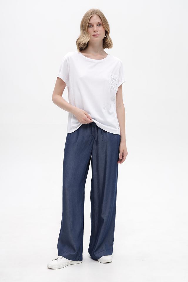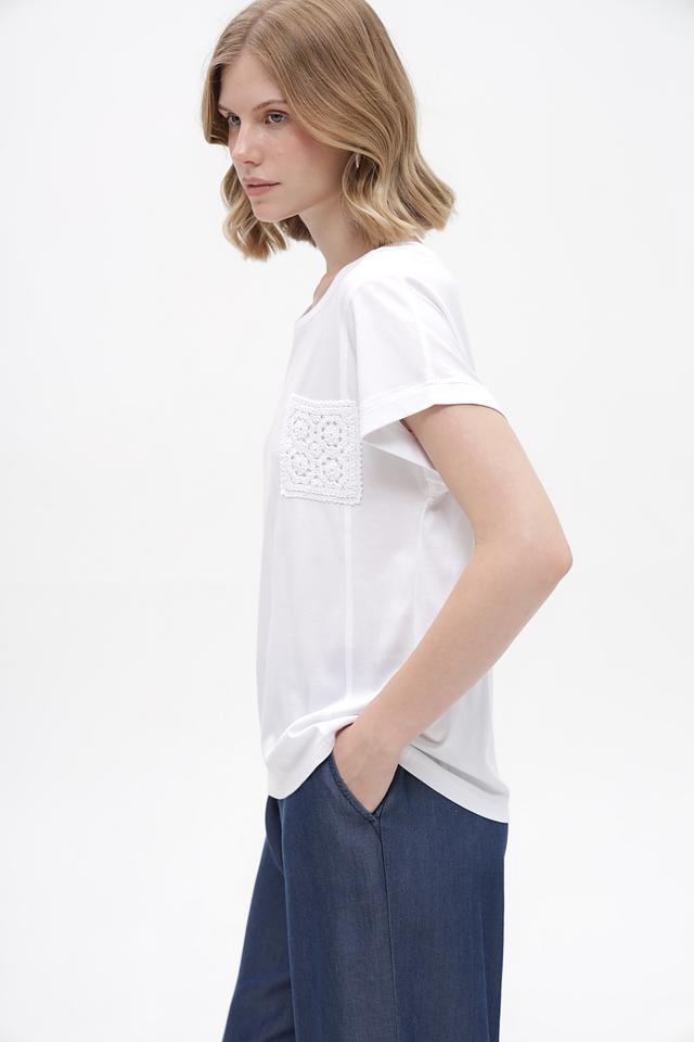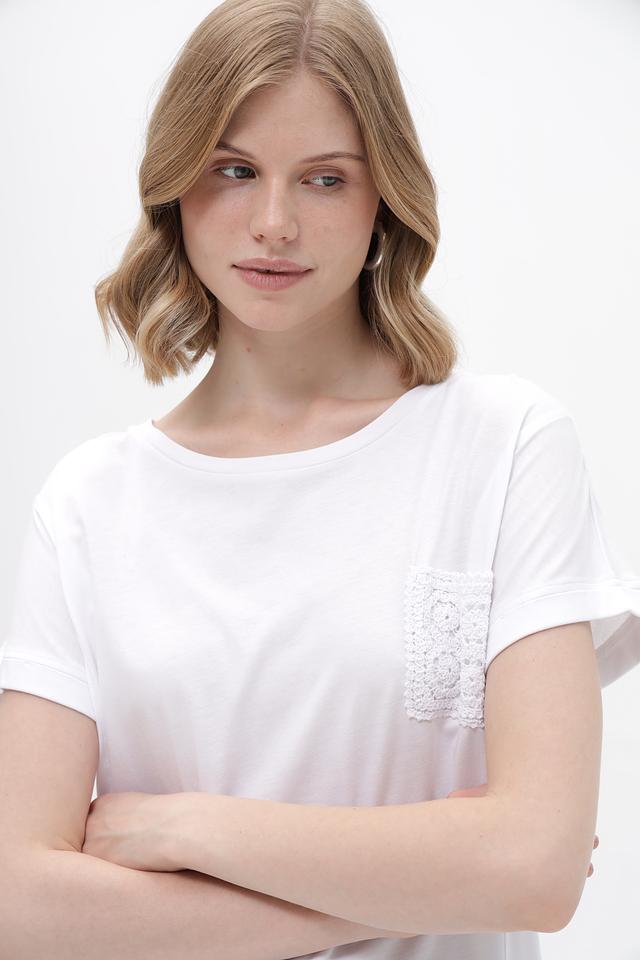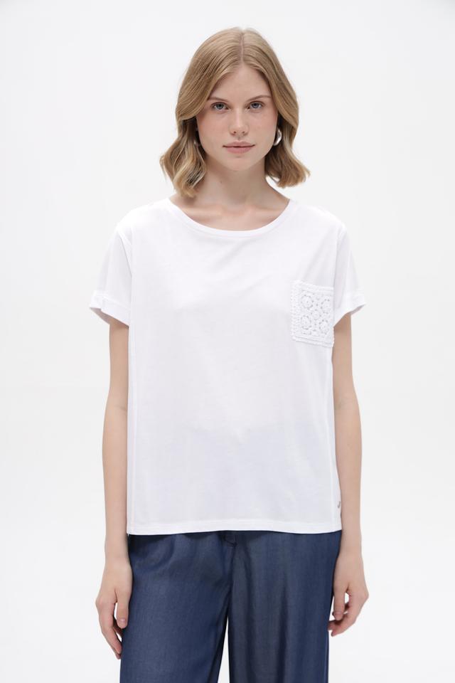 Дизайн футболки лаконичный, но при этом привлекательный благодаря декоративному кружевному карману на груди. Футболка имеет округлый вырез горловины и короткие рукава с небольшим подворотом. Свободный крой не сковывает движений и позволяет создать расслабленный образ.