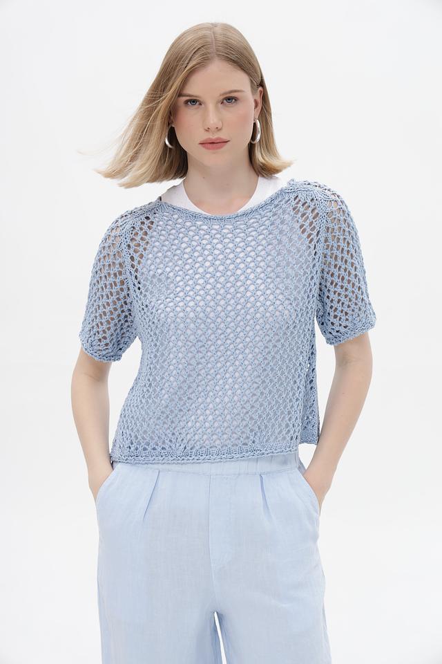 Женский пуловер от бренда Monari выполнен в светло-голубом цвете. Модель имеет короткие рукава и укороченный крой, что делает ее идеальным выбором для теплых дней.