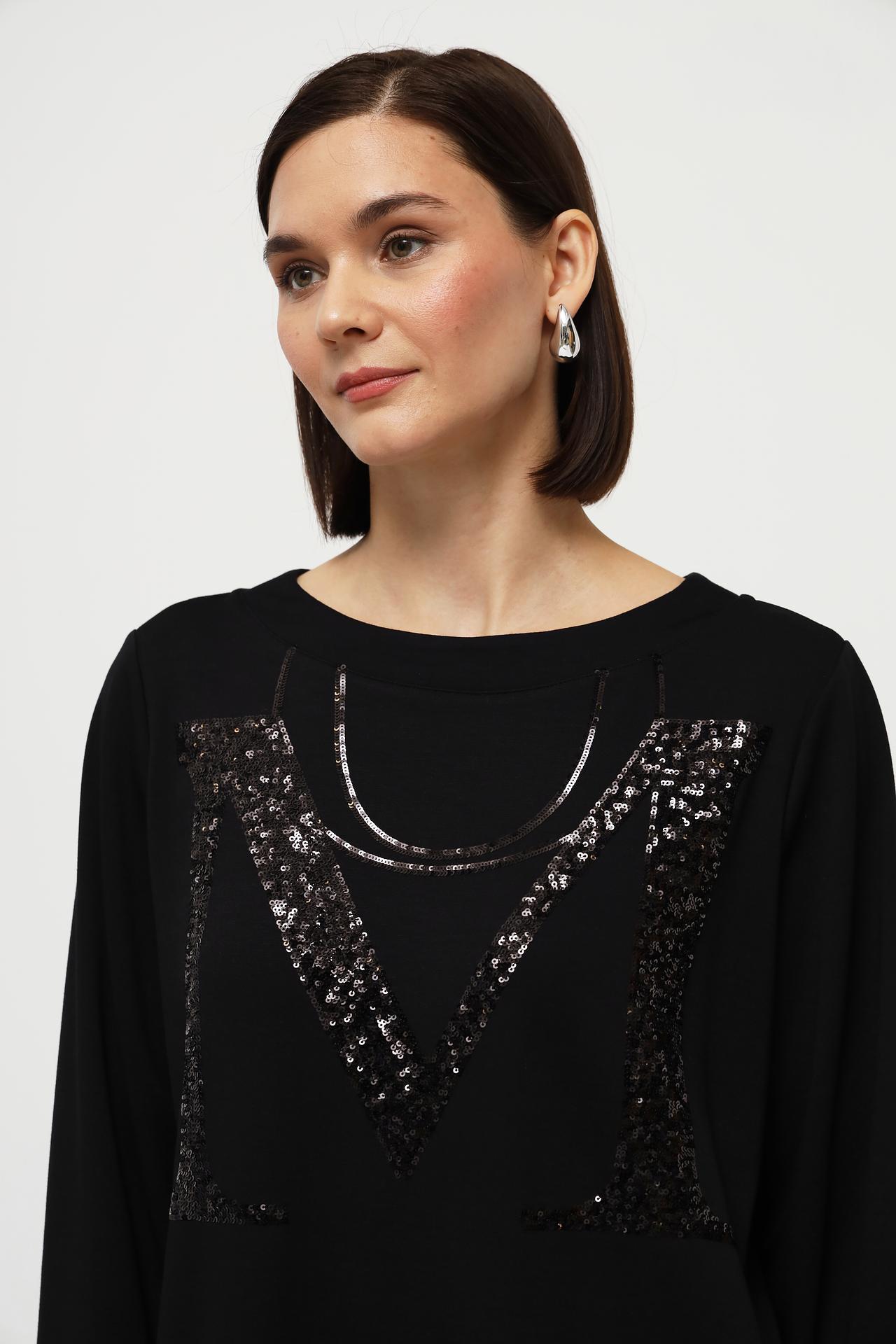 Элегантное черное платье от Monari — идеальный выбор для создания стильного образа. Модель прямого кроя с длинным рукавом и круглым вырезом гармонично садится по фигуре, обеспечивая комфорт в течение всего дня. Акцент в виде крупной буквы "M", выполненной из блестящих пайеток, придает платью оригинальность и притягательность.