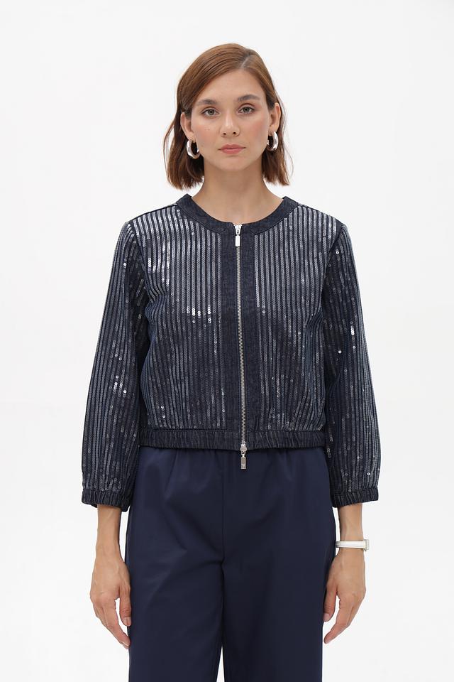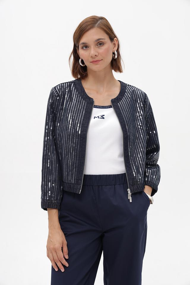 Этот стильный жакет от Monari выполнен в темно-синем цвете и украшен вертикальными полосками, добавляющими динамики образу. Жакет имеет укороченный крой и застегивается на молнию.