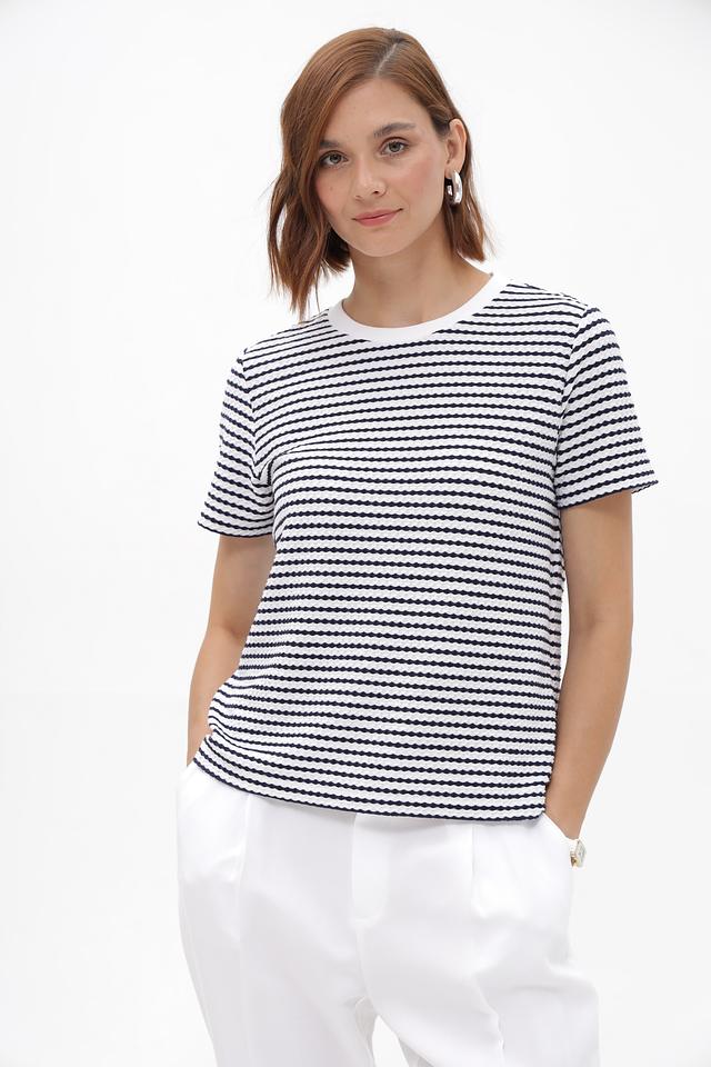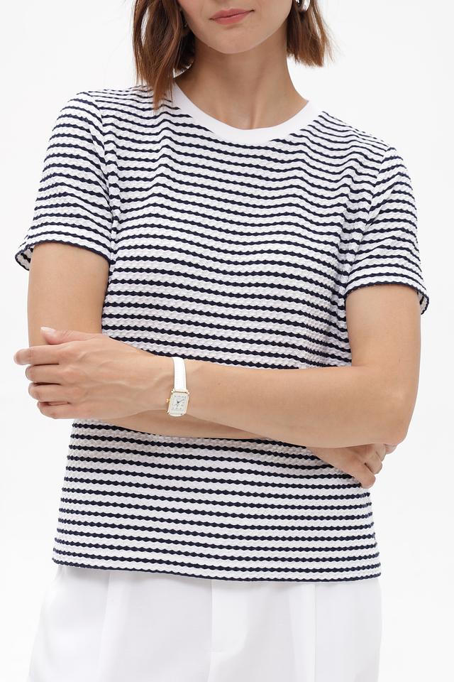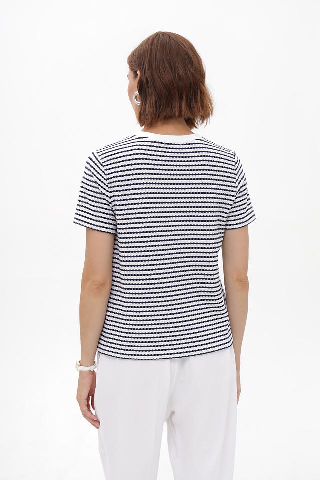 Женская футболка Monari выполнена в классическую бело-синюю полоску. Модель с коротким рукавом и круглым вырезом станет отличным дополнением к вашему образу. Изготовлена из приятной к телу ткани. Состав: полиэстер 66%, вискоза 30%, эластан 4%