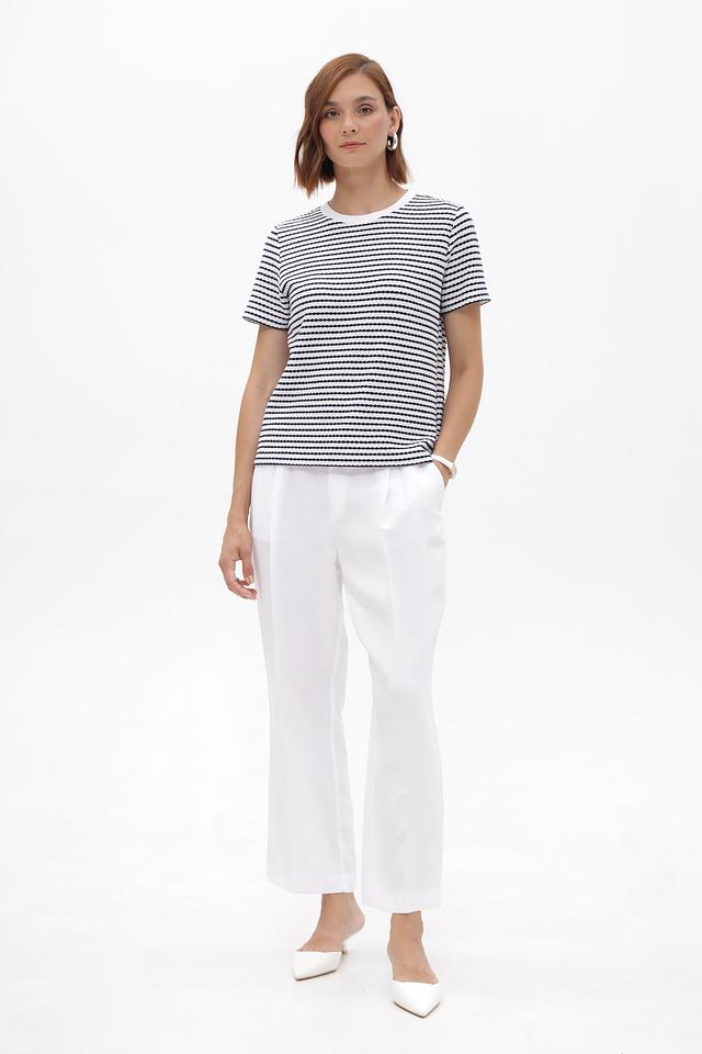 Эта стильная футболка от Monari станет незаменимой вещью в вашем гардеробе. Классический дизайн в бело-синюю полоску делает ее универсальной и подходящей для различных образов.