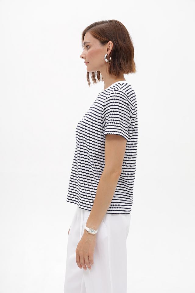 Футболка имеет прямой крой, который обеспечивает комфортную посадку по фигуре. Короткие рукава и круглый вырез горловины добавляют ей непринужденности и легкости.