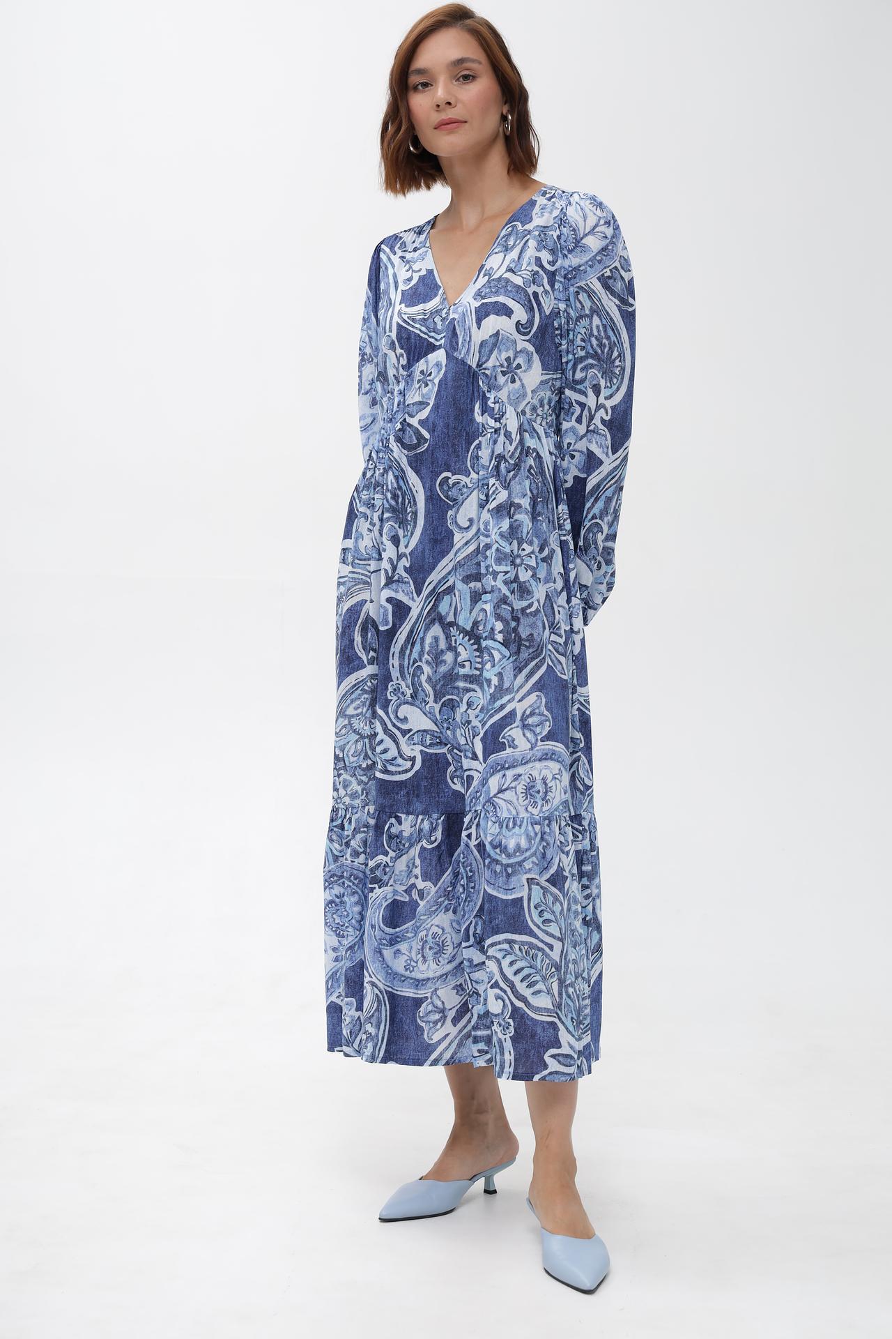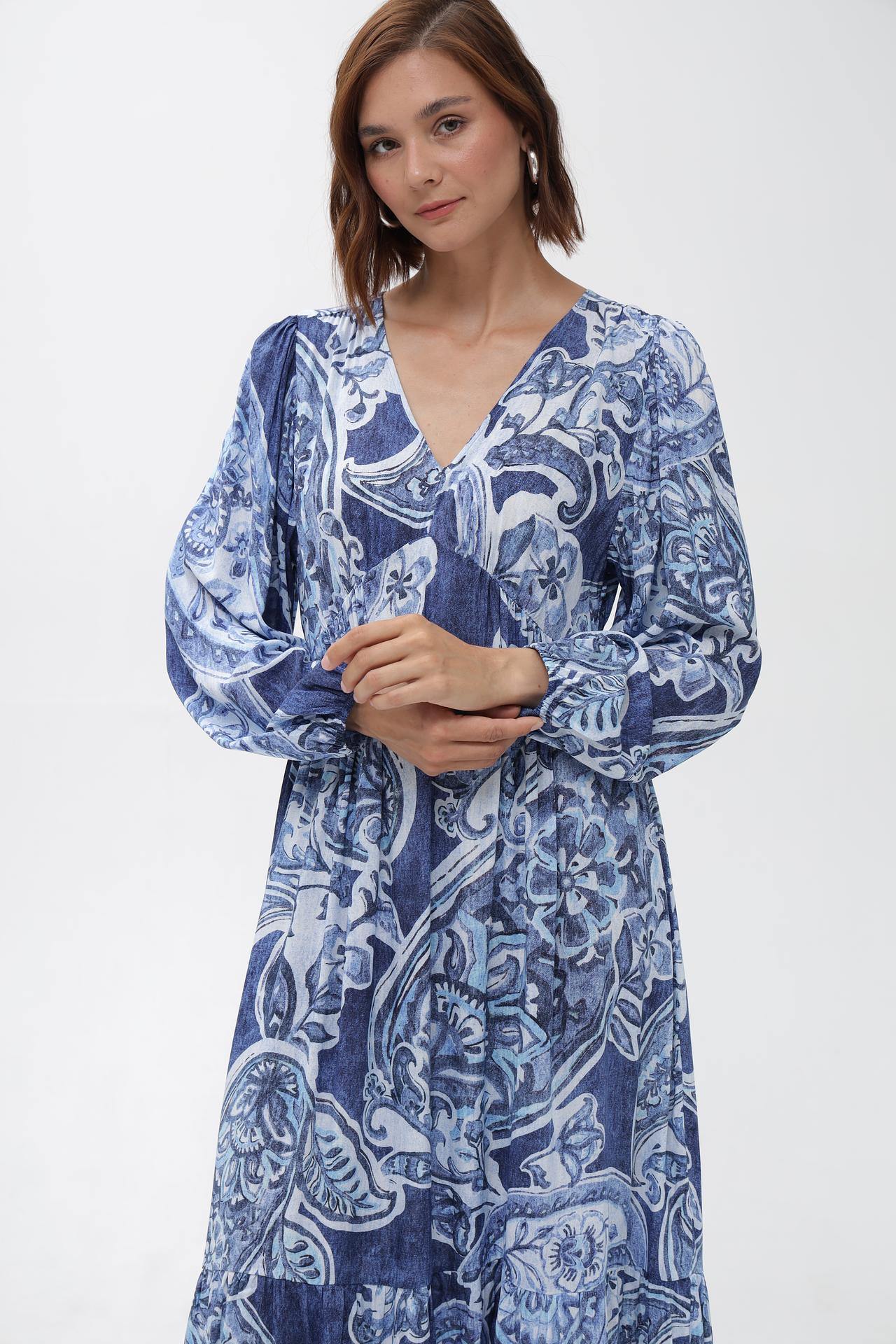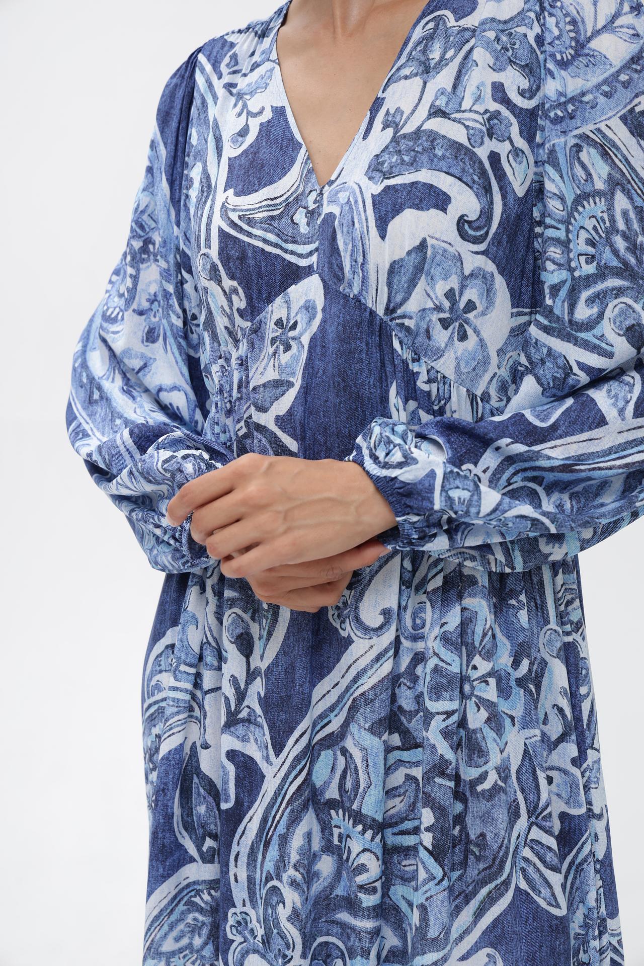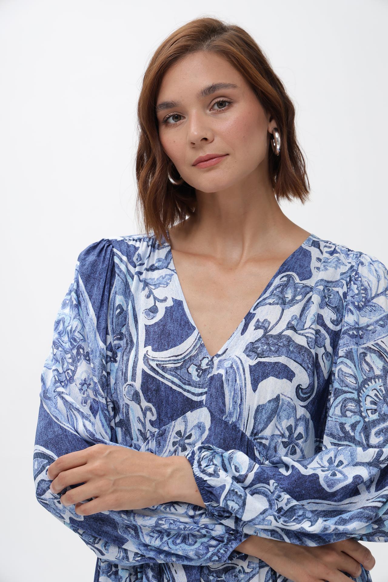 - Дизайн: Оригинальный принт в синих и белых тонах, V-образный вырез и рукава-фонарики создают утонченный и модный образ.