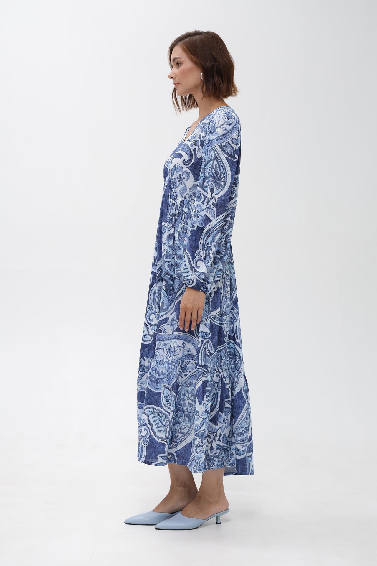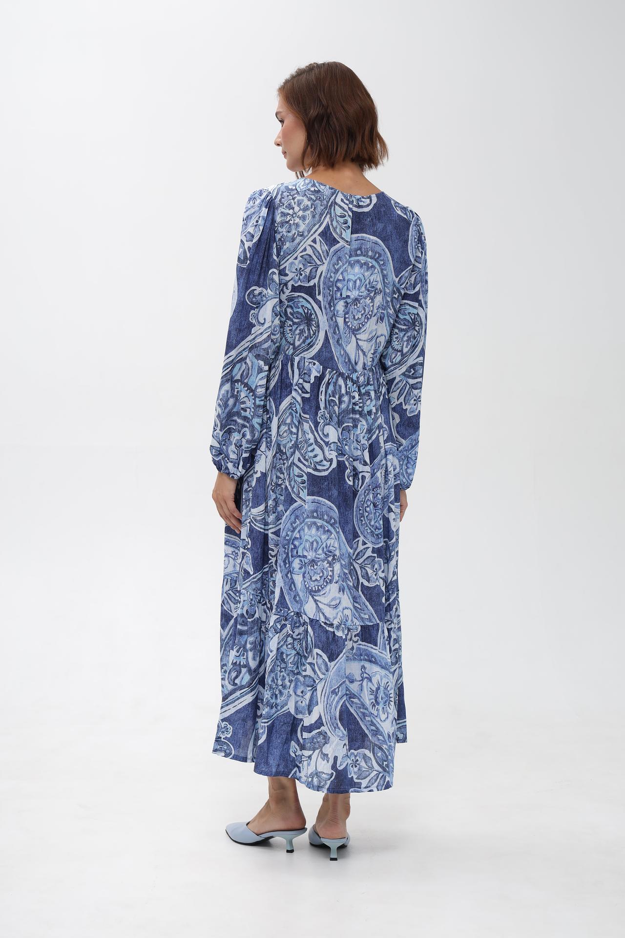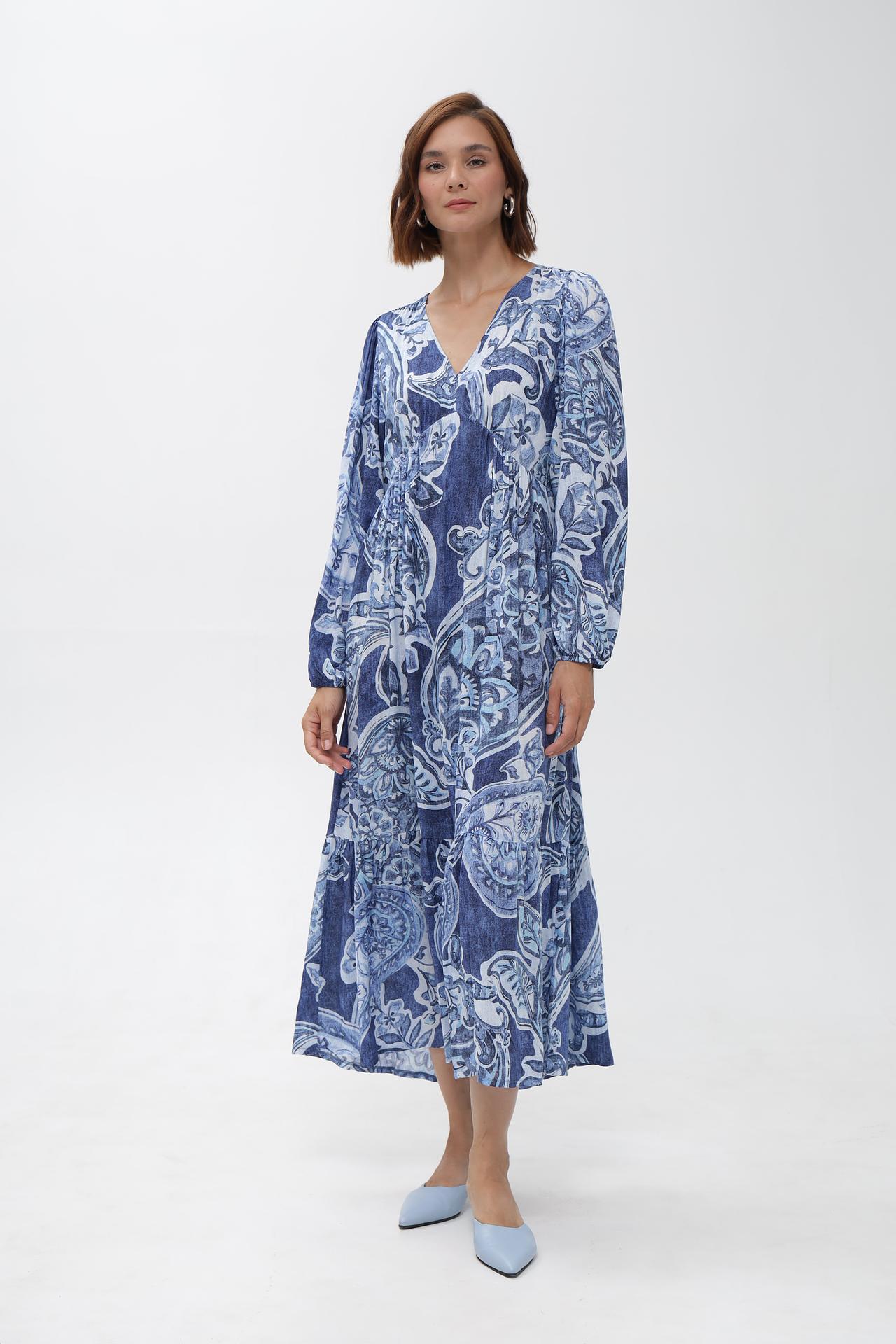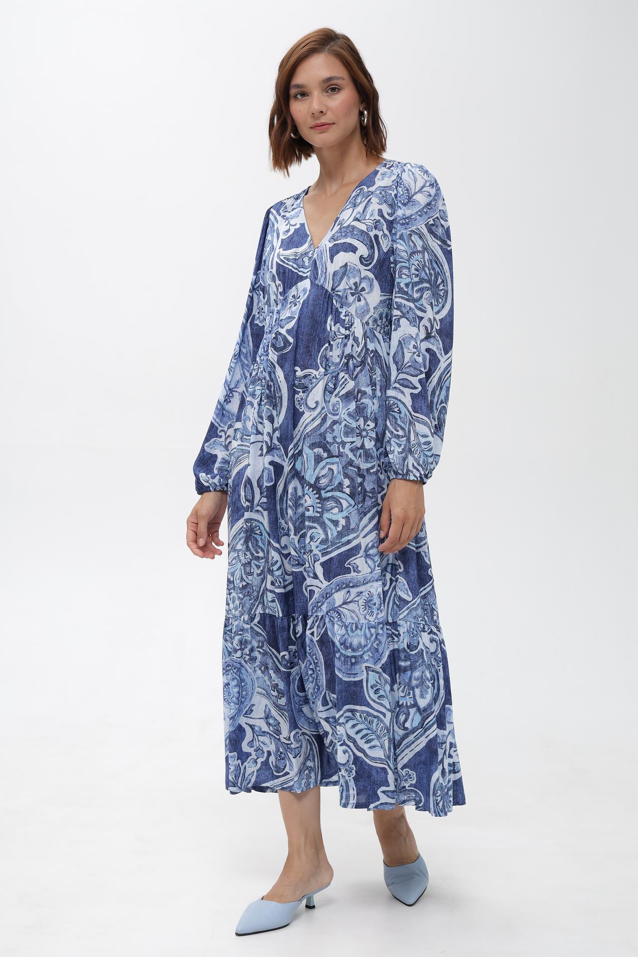 - Дизайн: Оригинальный принт в синих и белых тонах, V-образный вырез и рукава-фонарики создают утонченный и модный образ.