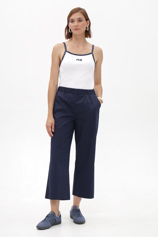 Женские брюки-кюлоты от бренда Monari выполнены в классическом темно-синем цвете. Модель имеет прямой крой, зауженный к низу, создающий эффект кюлотов.