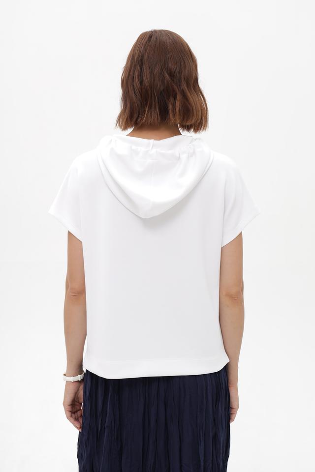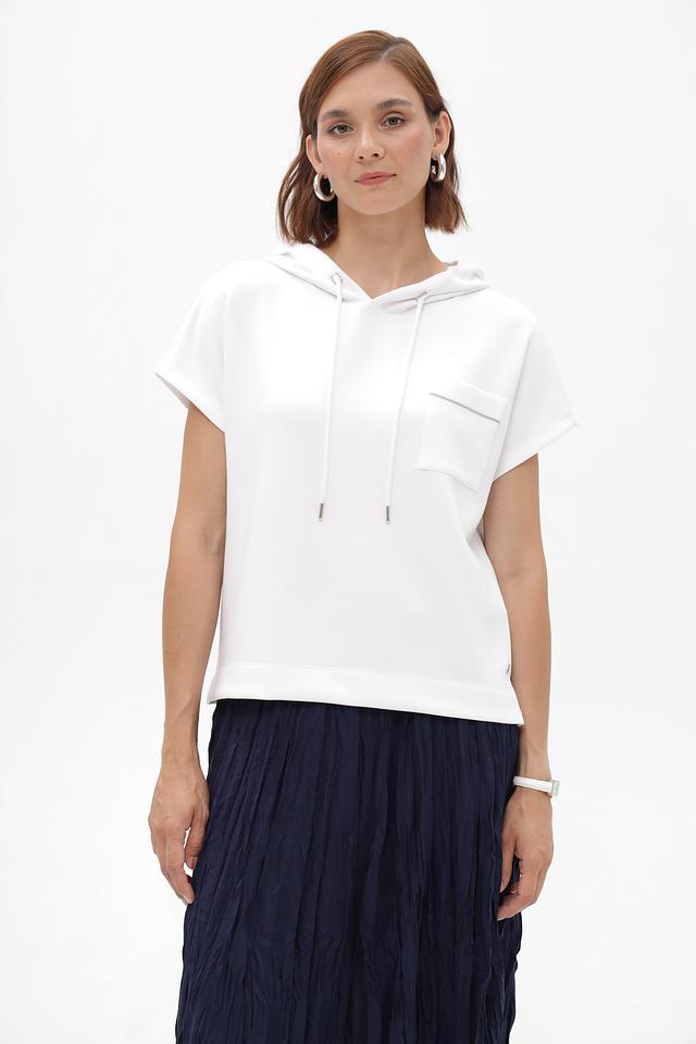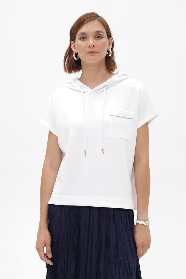 Белый пуловер от Monari с короткими рукавами и капюшоном – стильное и комфортное решение для повседневного образа. Модель выполнена из мягкого и приятного к телу материала, обеспечивающего удобство в носке. Состав: модал 52%, полиэстер 42%, эластан 6%