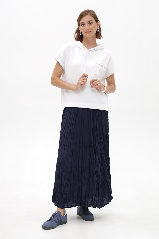 Модель имеет удобный капюшон с завязками, короткие рукава и прямой крой. Пуловер выполнен из высококачественного модала, полиэстера и эластана, что обеспечивает комфорт и долговечность изделия. Состав ткани позволяет ей хорошо держать форму и не деформироваться после стирки.