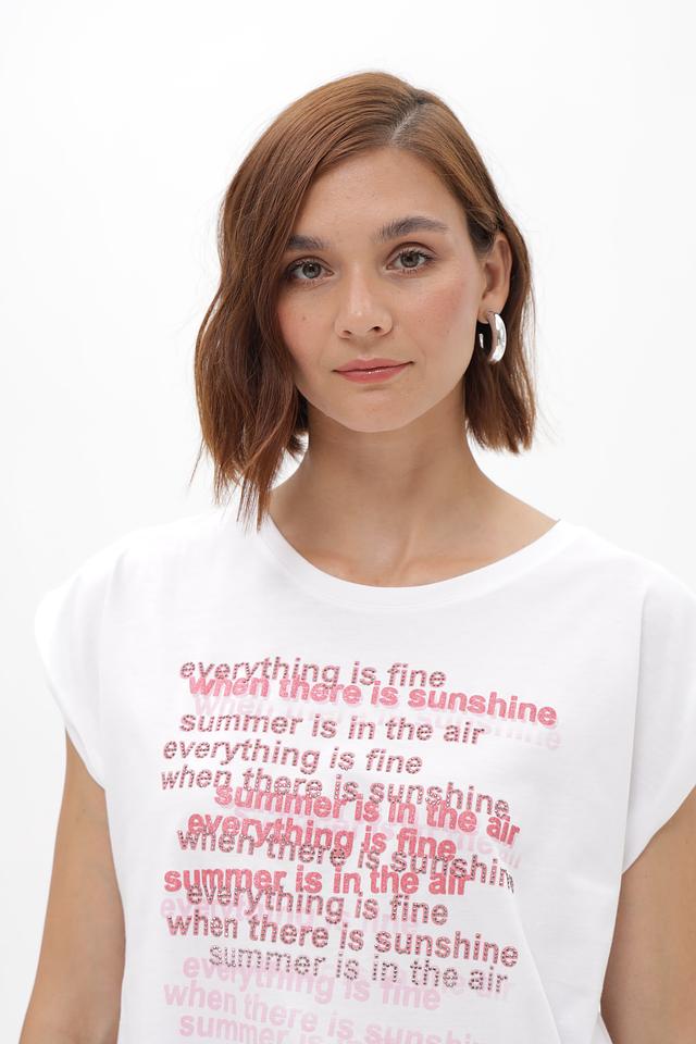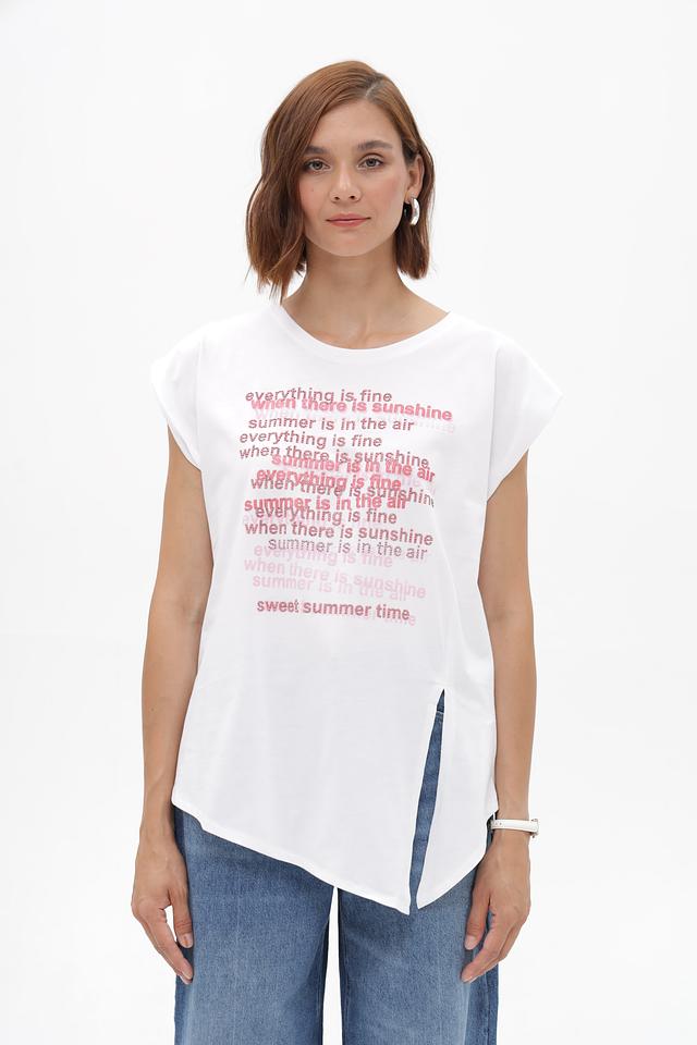 Представляем стильную и комфортную футболку от бренда Monari. Эта модель выполнена в белом цвете и украшена ярким принтом с текстовыми элементами.