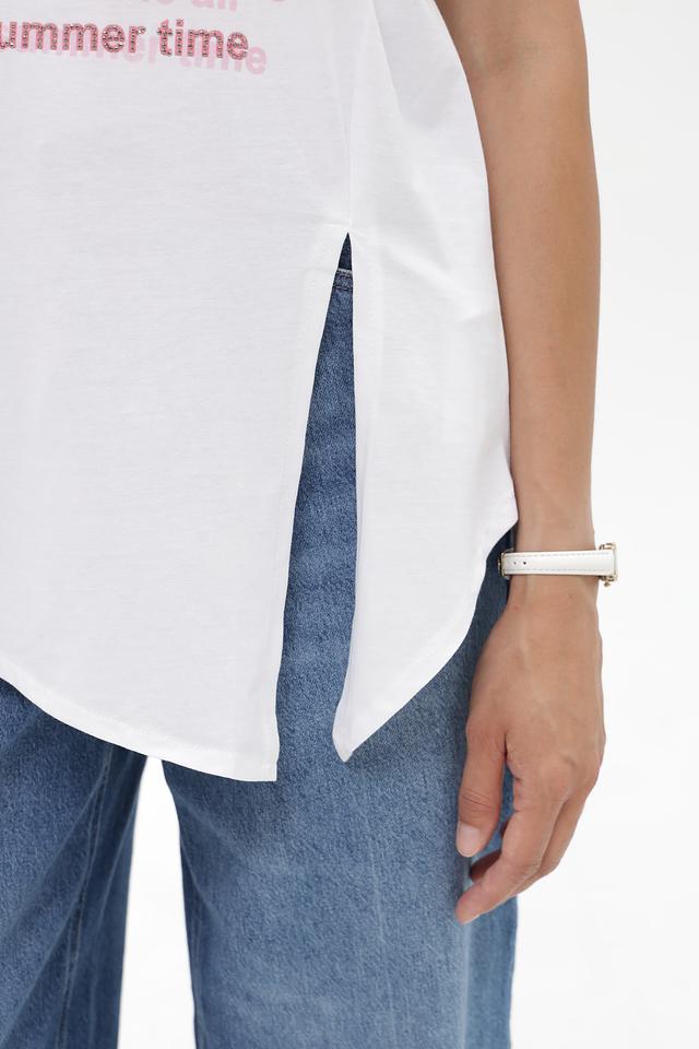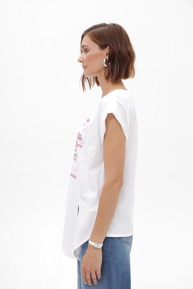 Футболка имеет свободный крой, который не сковывает движений, и спущенные плечи, добавляющие образу непринужденность. Короткие рукава и разрезы по бокам обеспечивают дополнительный комфорт в теплую погоду.