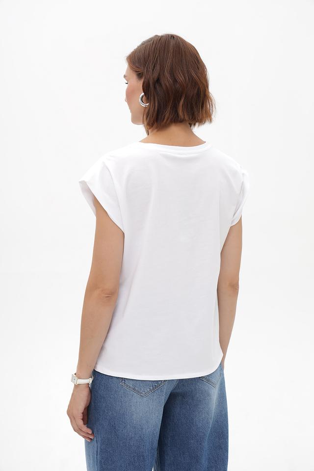 Белая футболка Monari с оригинальным принтом и спущенными плечами. Изготовлена из 100% хлопка, обеспечивающего комфорт в жаркую погоду. Отличный выбор для создания стильного повседневного образа. Состав: хлопок 100%