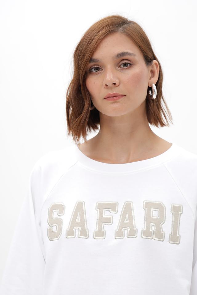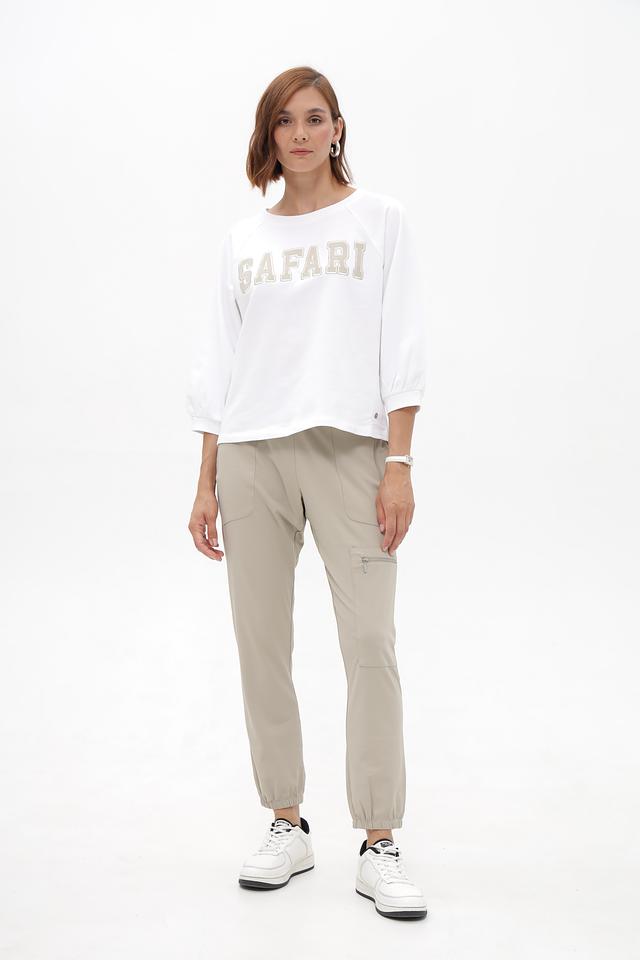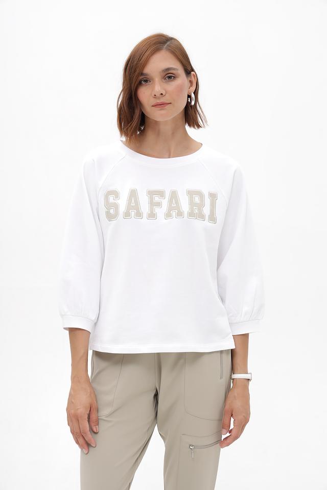Передняя часть пуловера декорирована крупной надписью "Safari", выполненной в светло-сером цвете, что добавляет образу оригинальности.