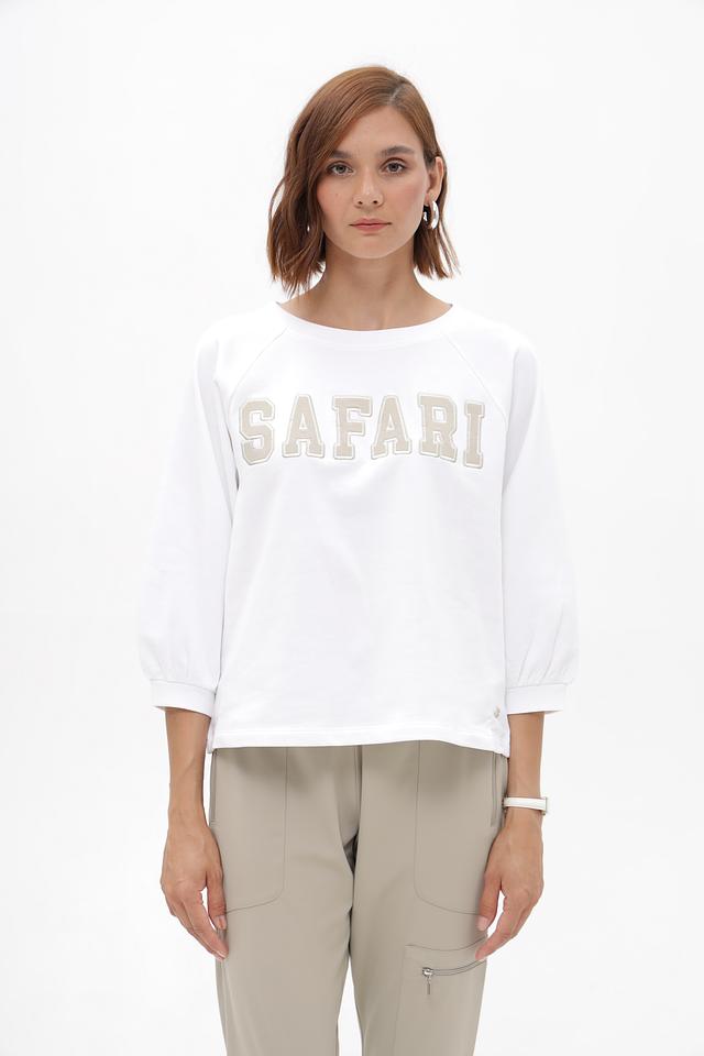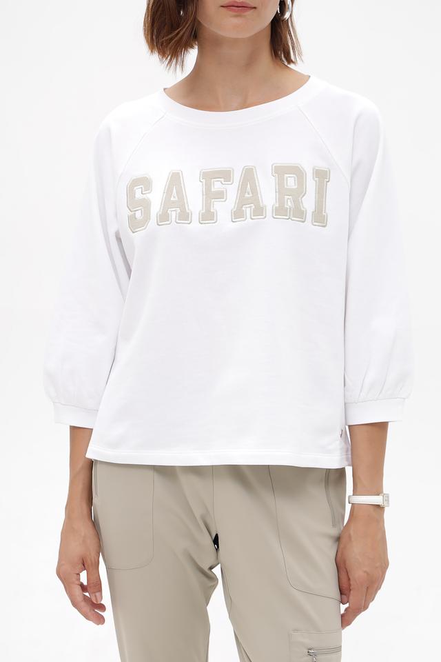 Белый пуловер Monari с декоративной надписью "Safari" — стильная и комфортная модель из 100% хлопка. Свободный крой и рукава 3/4 делают его идеальным выбором для создания повседневных образов. Состав: хлопок 100%