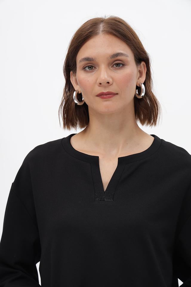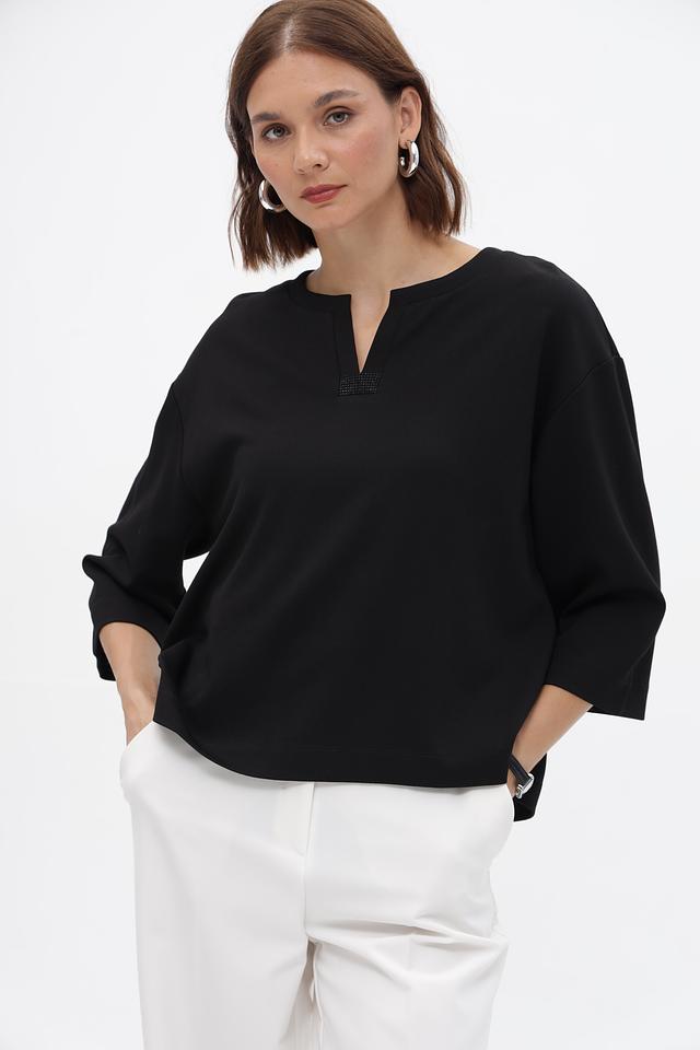 Чёрный пуловер от Monari с декоративной вышивкой на вырезе. Модель выполнена из вискозы с добавлением полиэстера и эластана, обеспечивающих комфорт и хорошую посадку. Состав: вискоза 80%, полиэстер 15%, эластан 5%
