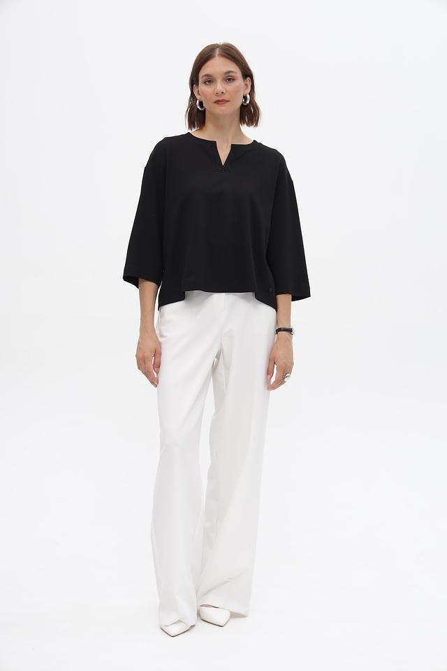 Вырез горловины оформлен в виде V-образной прорези и украшен декоративной вышивкой, добавляющей изделию изысканности.