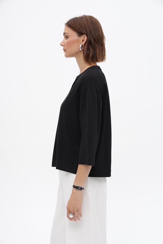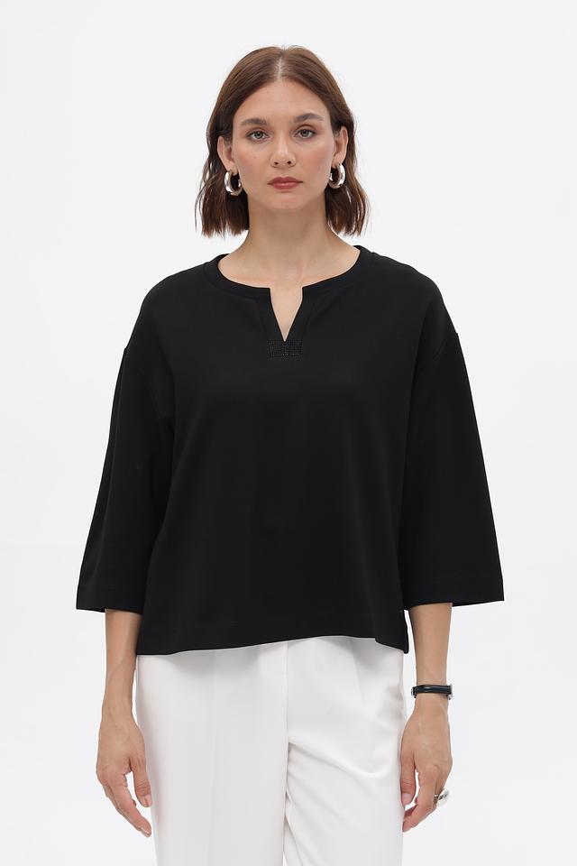 Чёрный пуловер от Monari — стильный и комфортный выбор для создания повседневных образов. Модель имеет свободный крой и короткие рукава, что обеспечивает свободу движений.