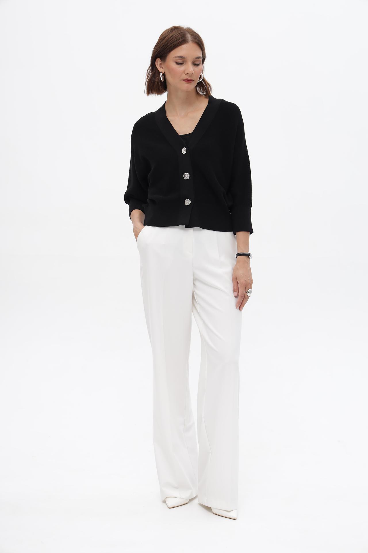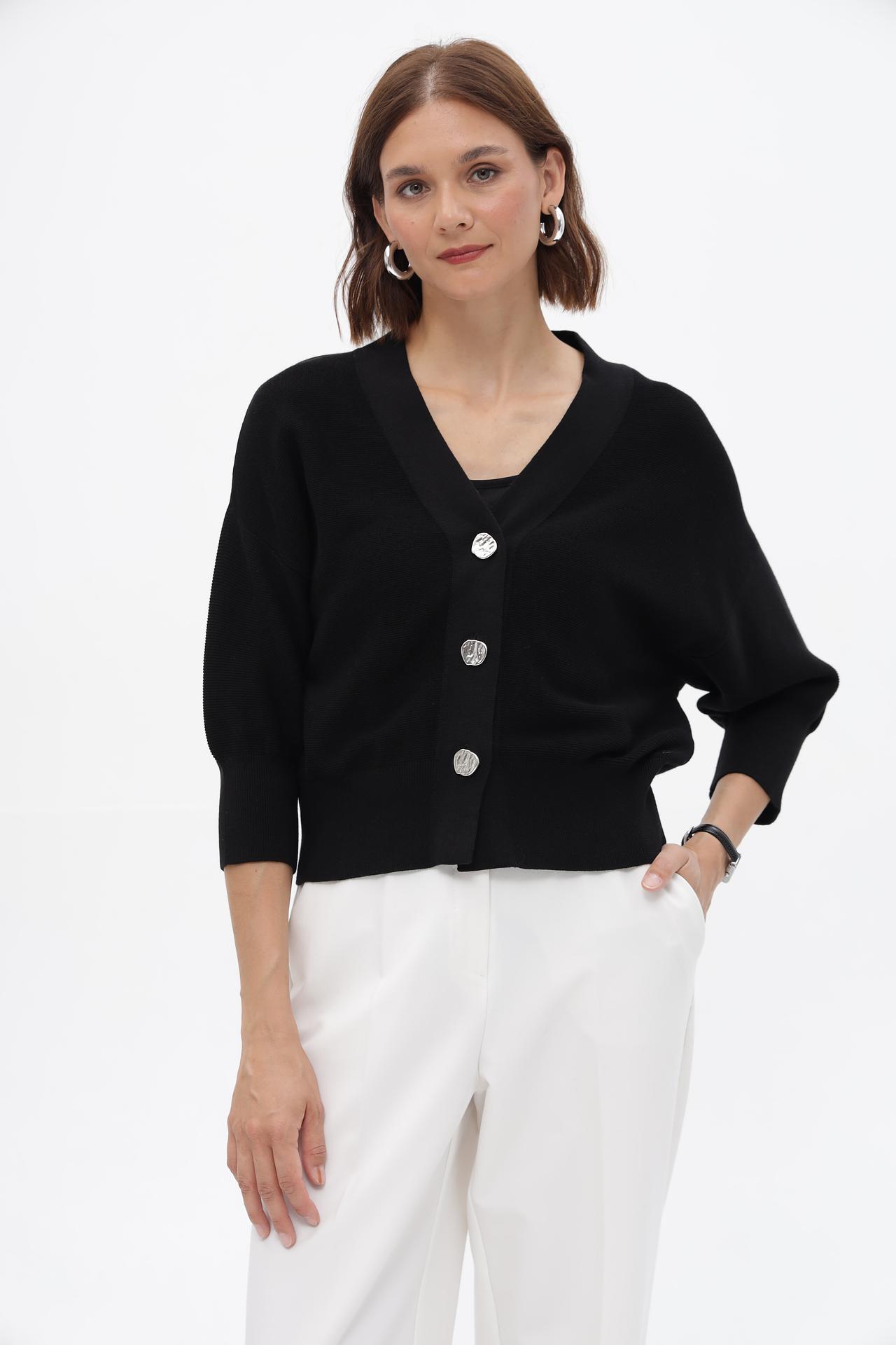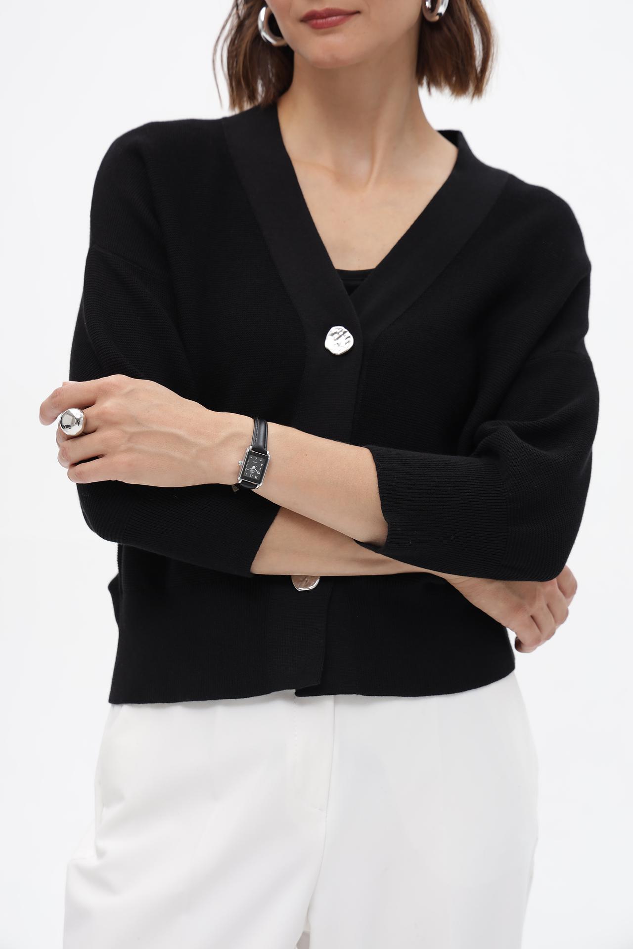 - Дизайн: Классический V-образный вырез и застежка на пуговицы. Модель имеет укороченный силуэт и рукава три четверти, что придает образу легкость и женственность.