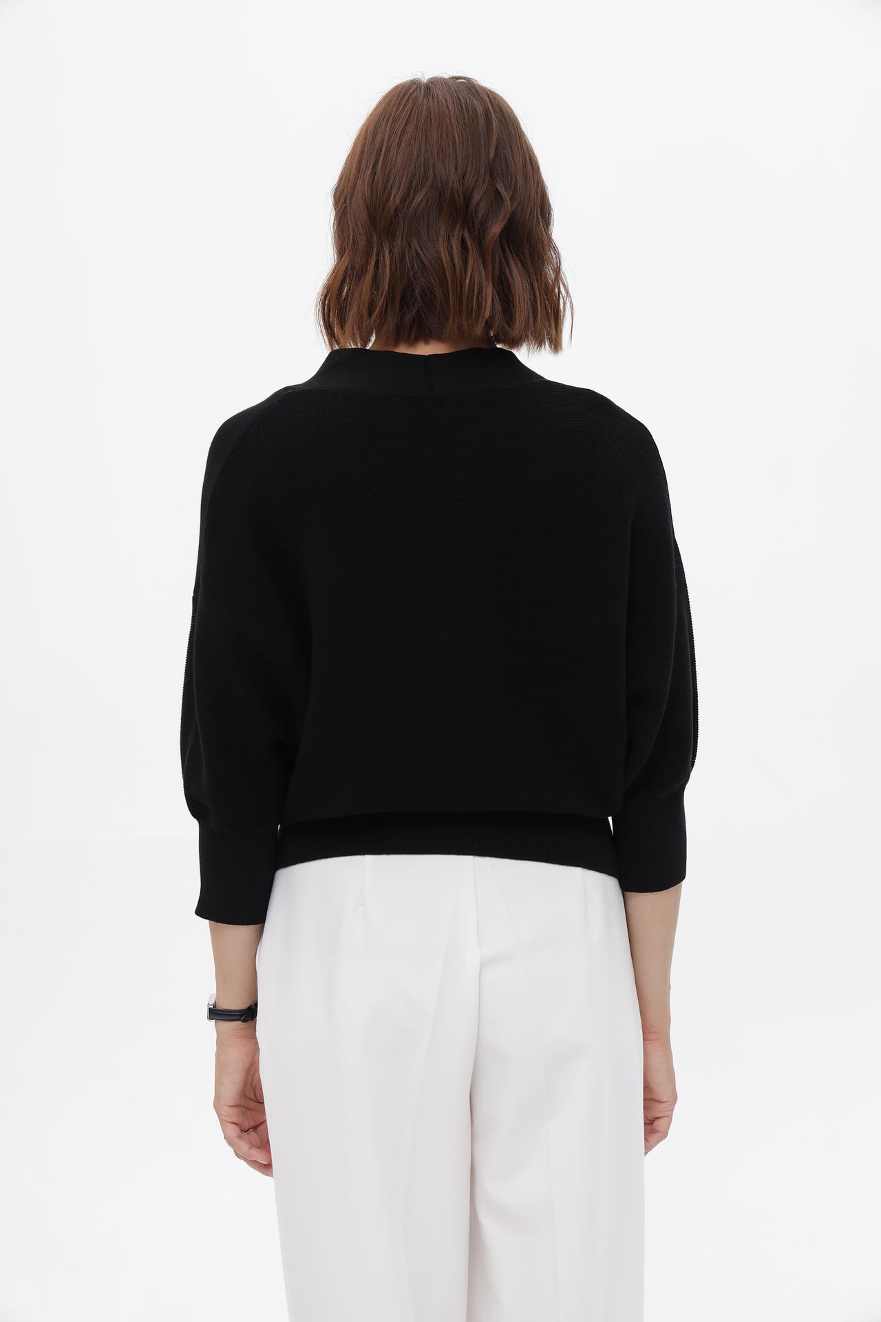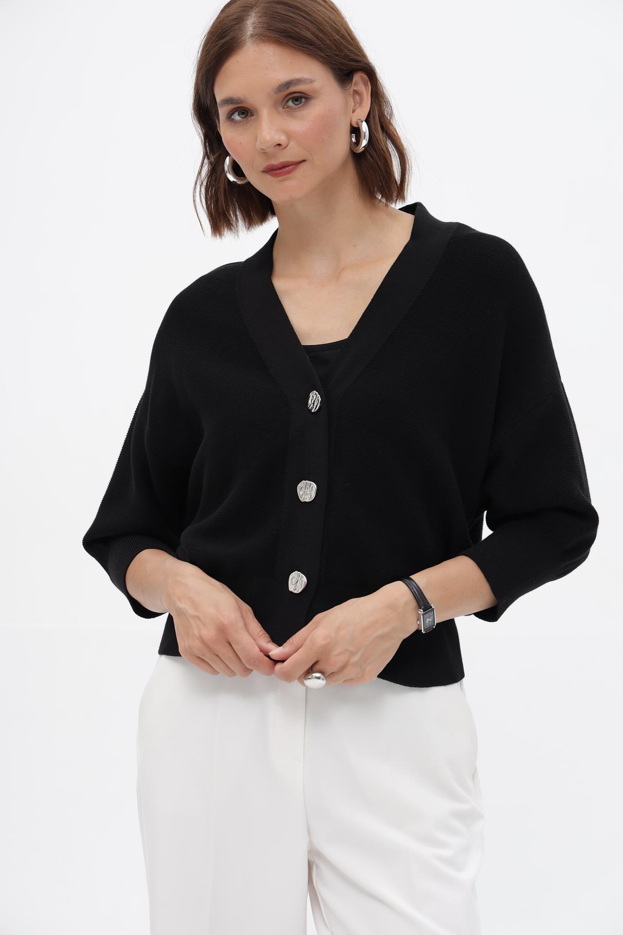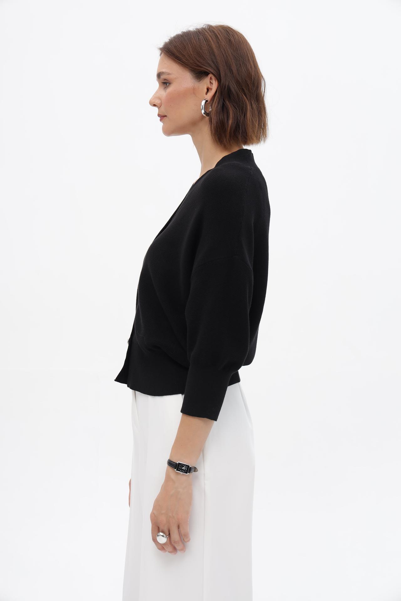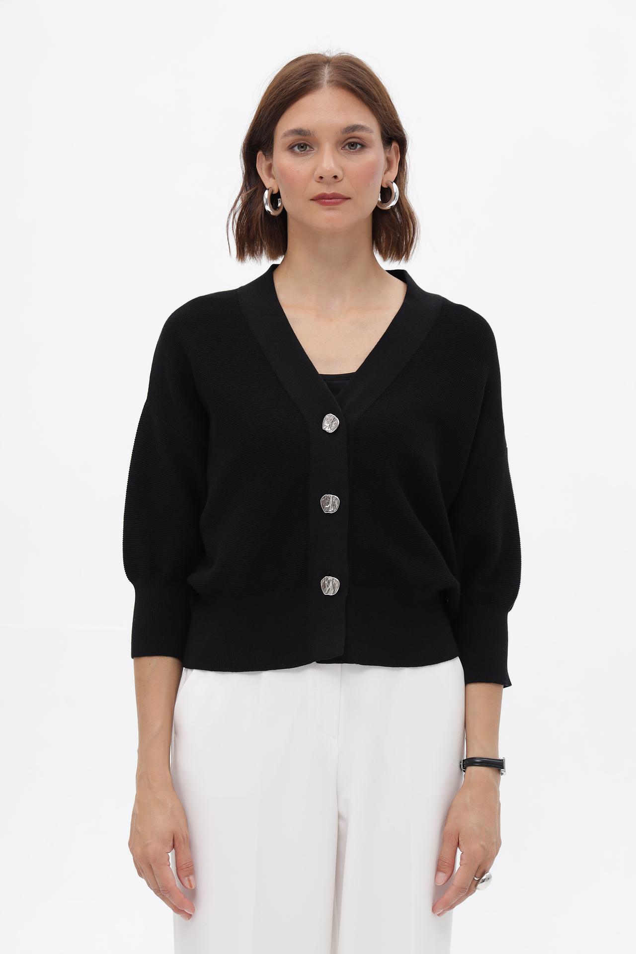 - Дизайн: Классический V-образный вырез и застежка на пуговицы. Модель имеет укороченный силуэт и рукава три четверти, что придает образу легкость и женственность.