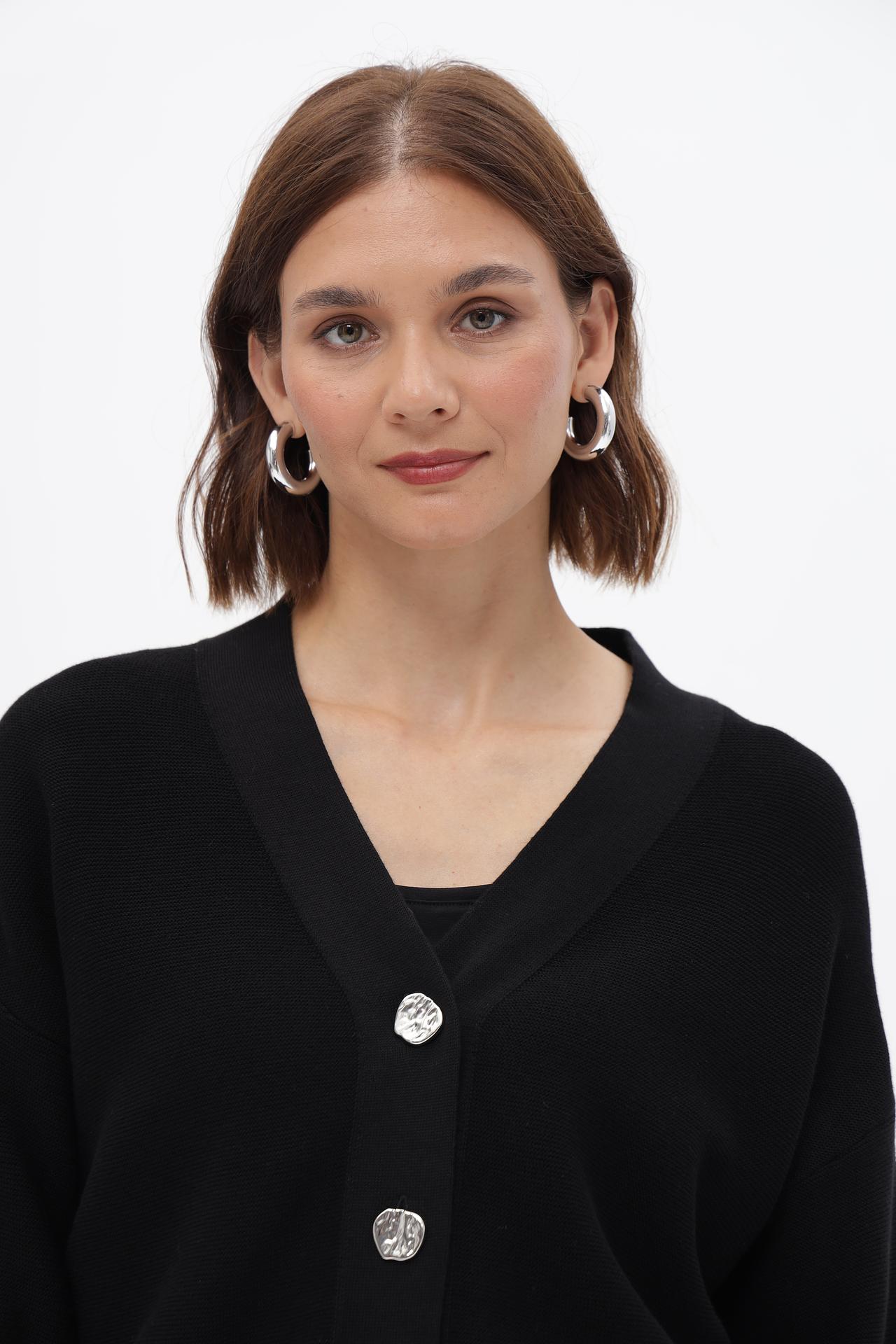 - Детали: Оригинальные серебристые пуговицы с фактурным узором служат стильным акцентом и подчеркивают изысканность изделия.