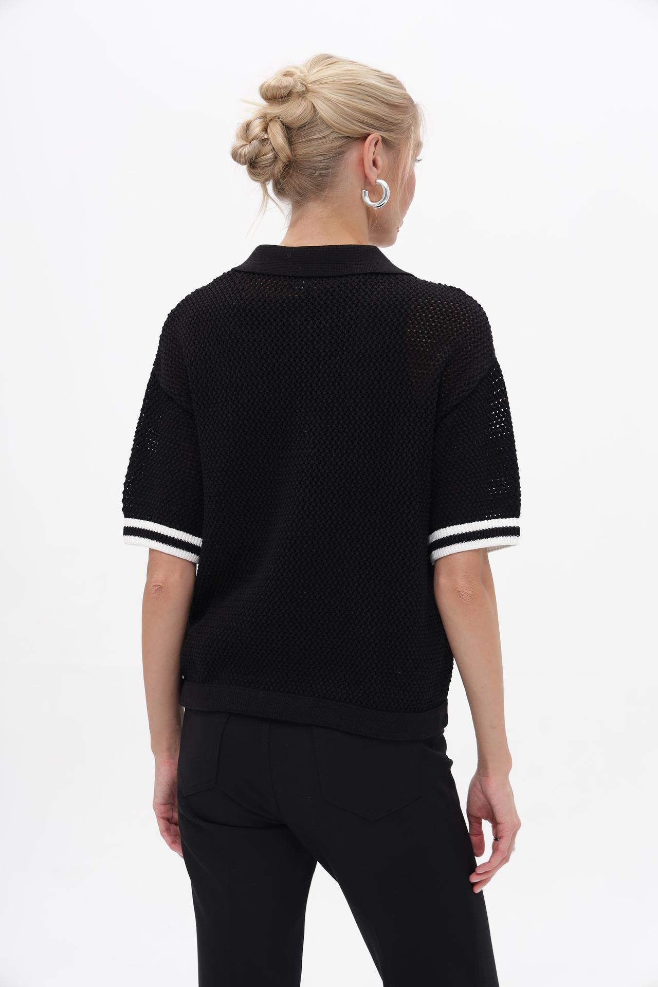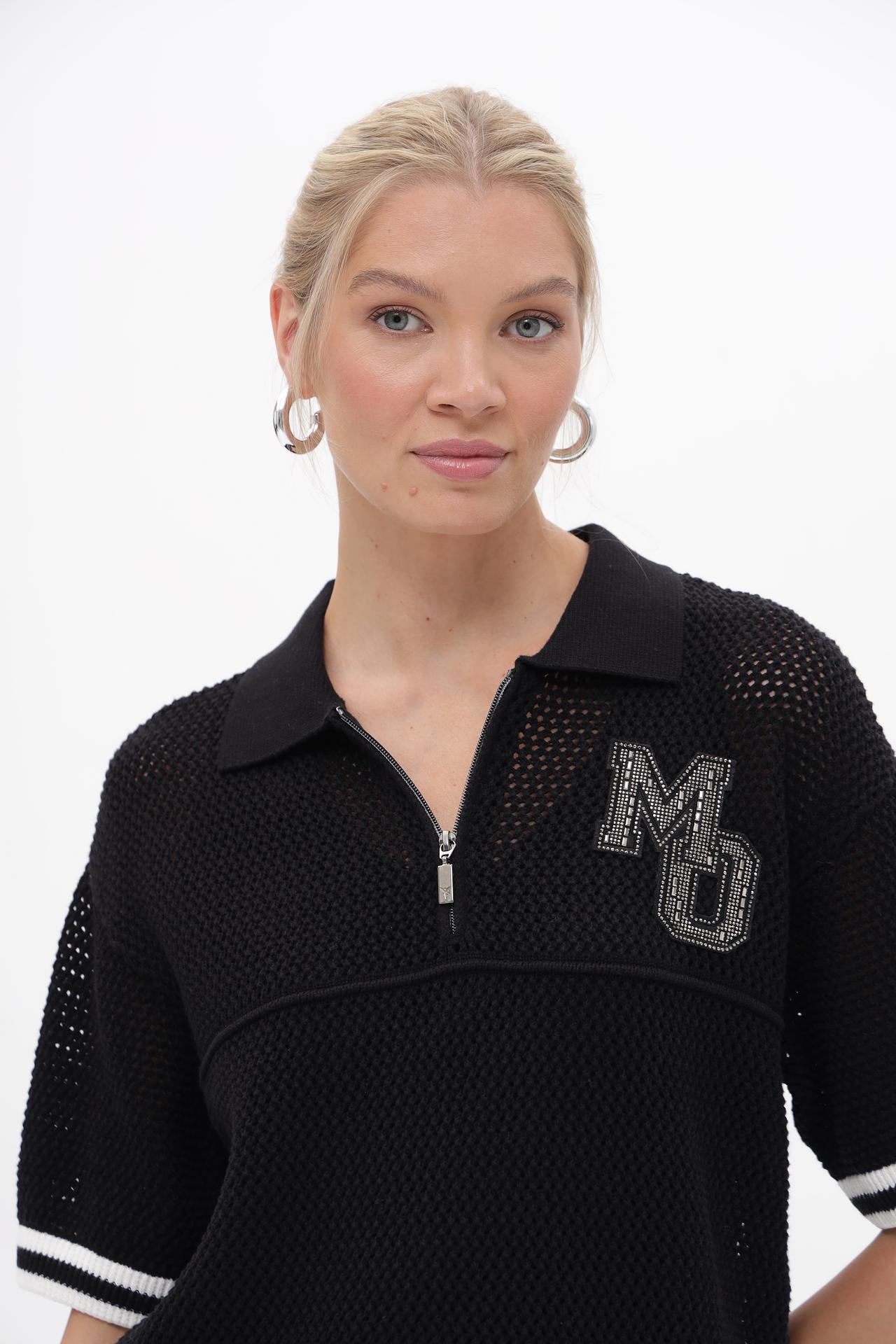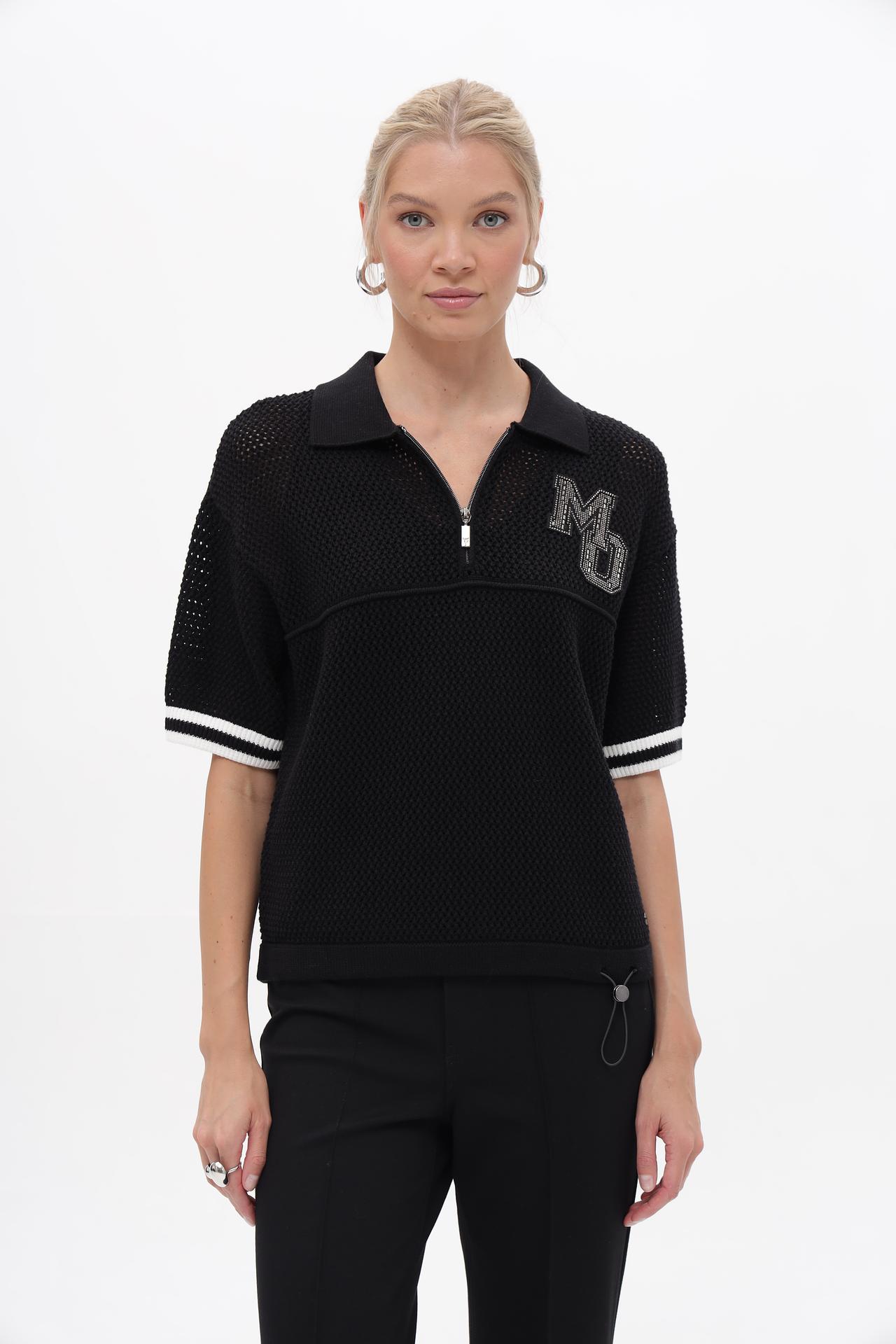 - Дизайн: Классический воротник-поло на молнии и короткие рукава придают модели спортивный шик. Контрастные манжеты и декоративная нашивка с кристаллами добавляют изюминку.