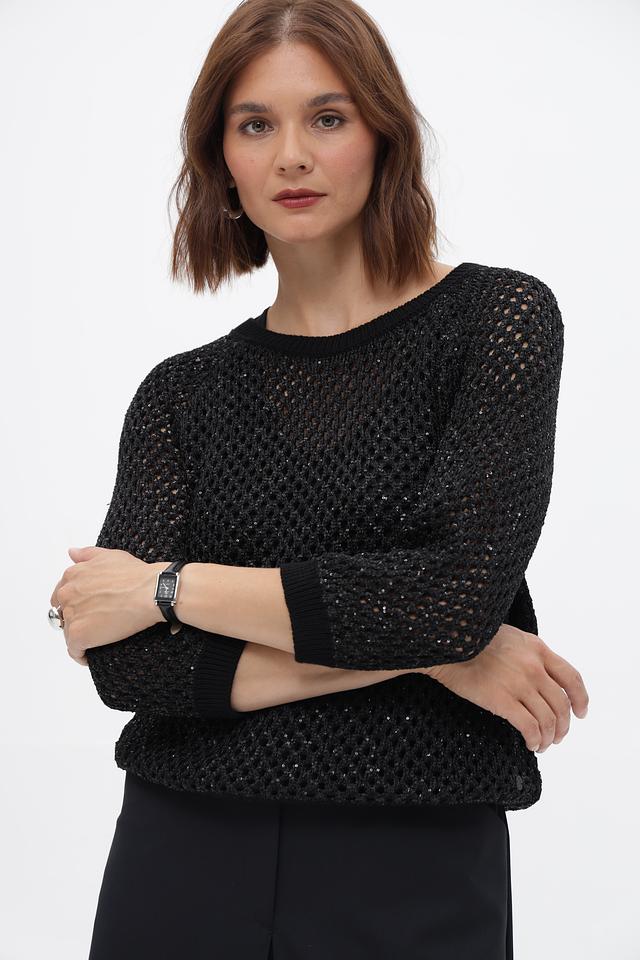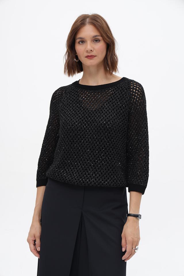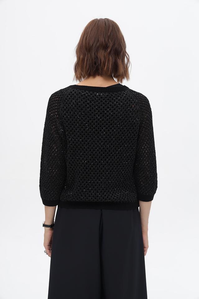 Чёрный пуловер от Monari с ажурной вязкой и рукавами 3/4. Модель выполнена из мягкого сочетания полиэстера и хлопка, обеспечивающего комфорт и удобство в носке. Состав: полиэстер 65%, хлопок 35%