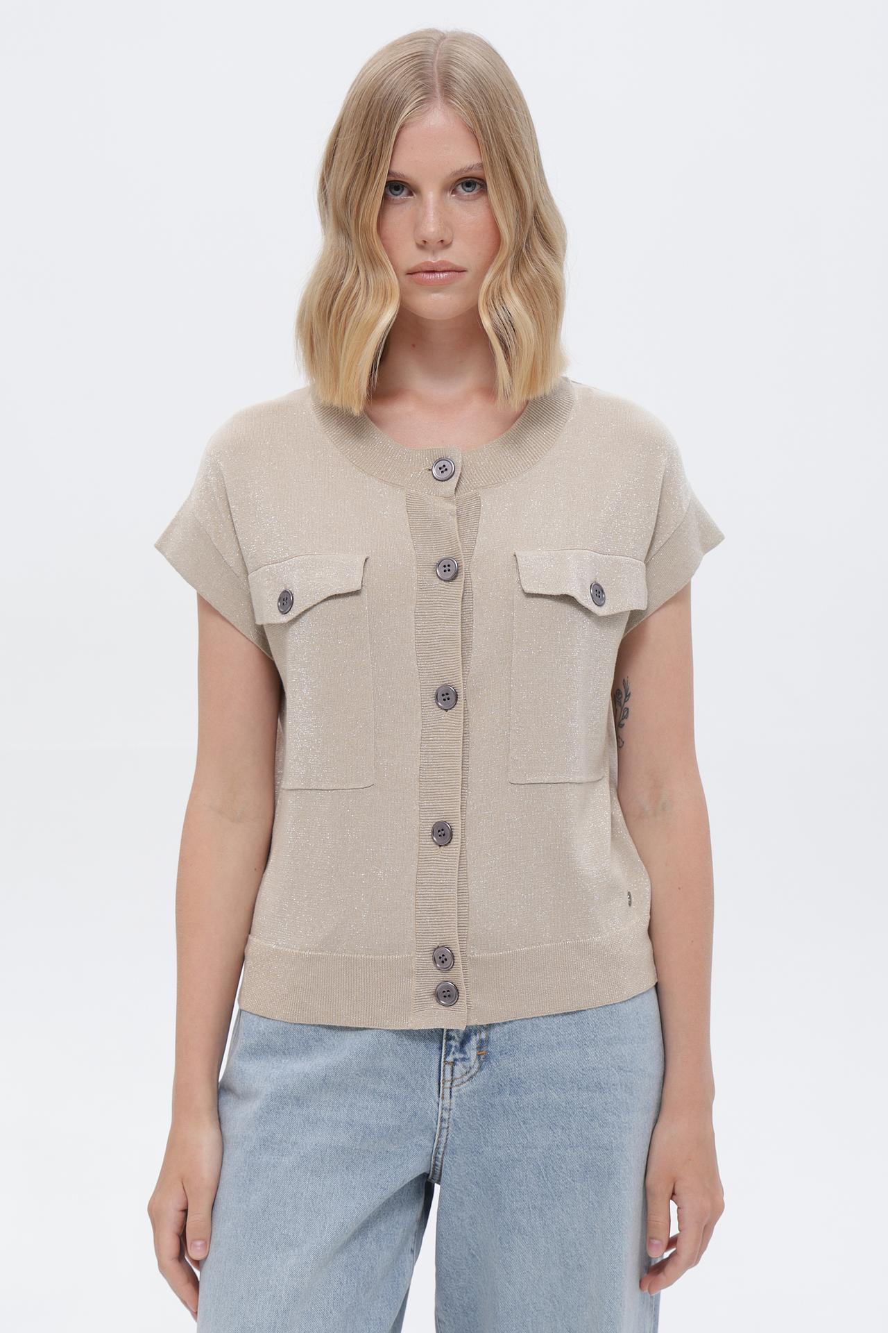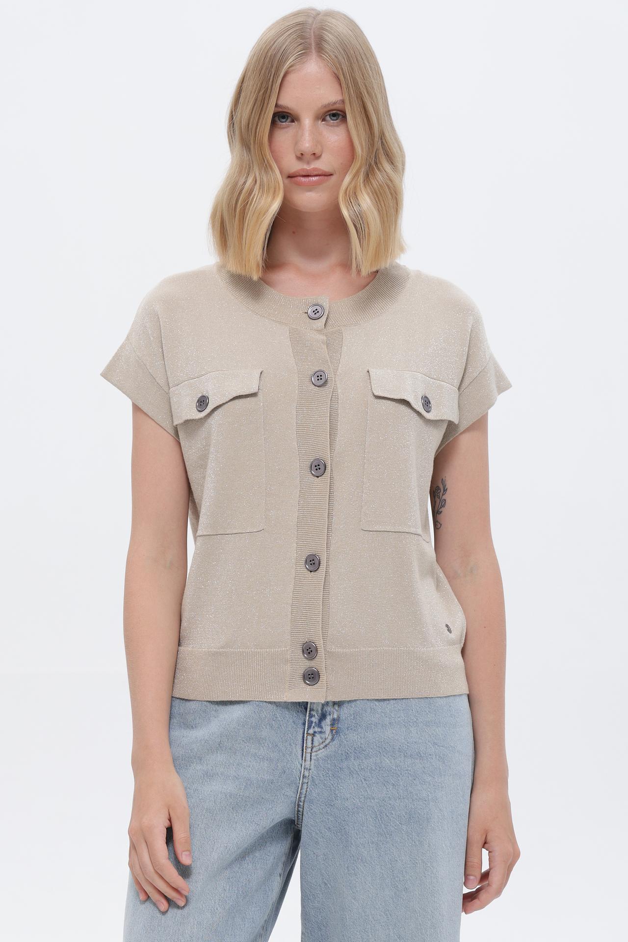 - Дизайн: Круглый вырез горловины и короткие рукава создают актуальный силуэт. Накладные карманы с клапанами и застежка на пуговицах подчеркивают классический стиль.