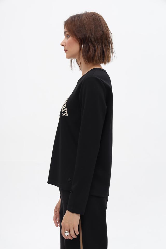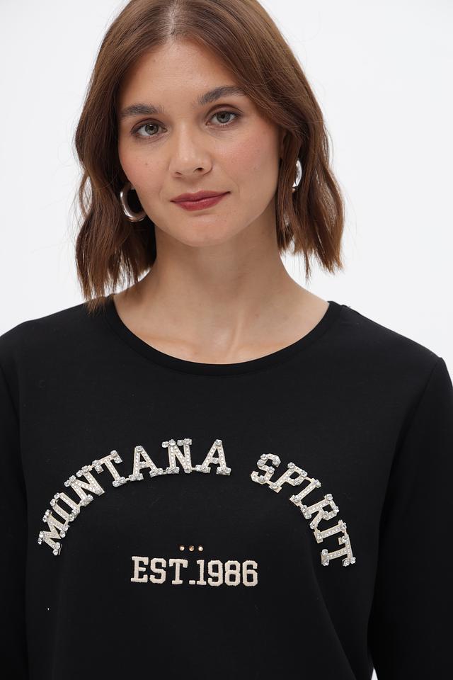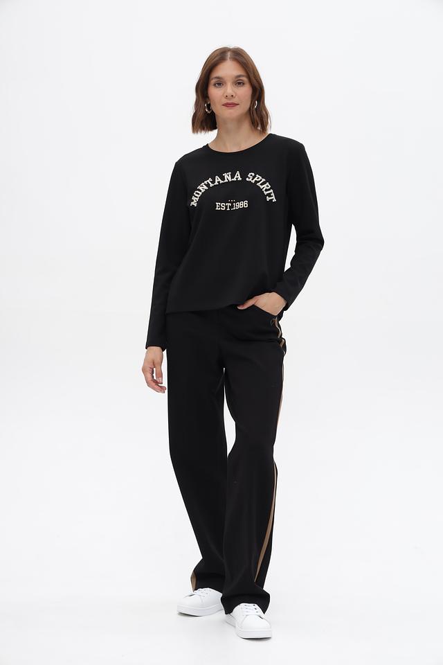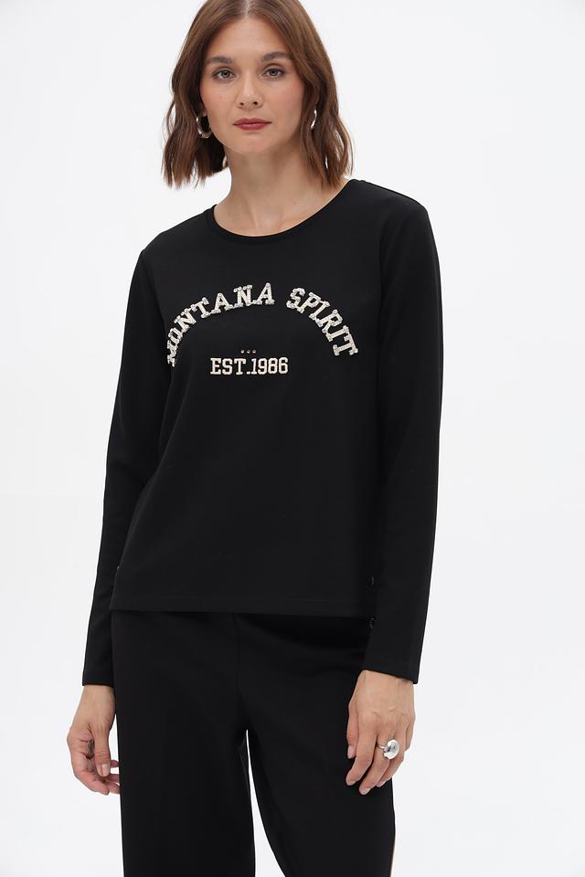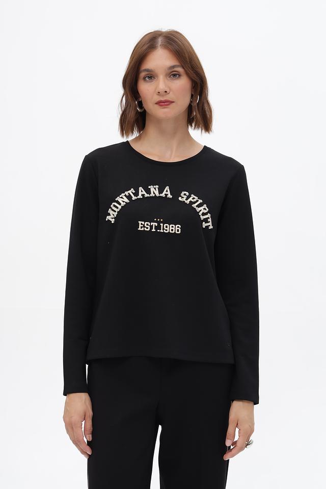 Этот стильный пуловер от Monari станет отличным дополнением к вашему гардеробу. Выполненный в классическом чёрном цвете, он украшен ярким принтом "Montana Spirit" с датой основания "EST.1986".