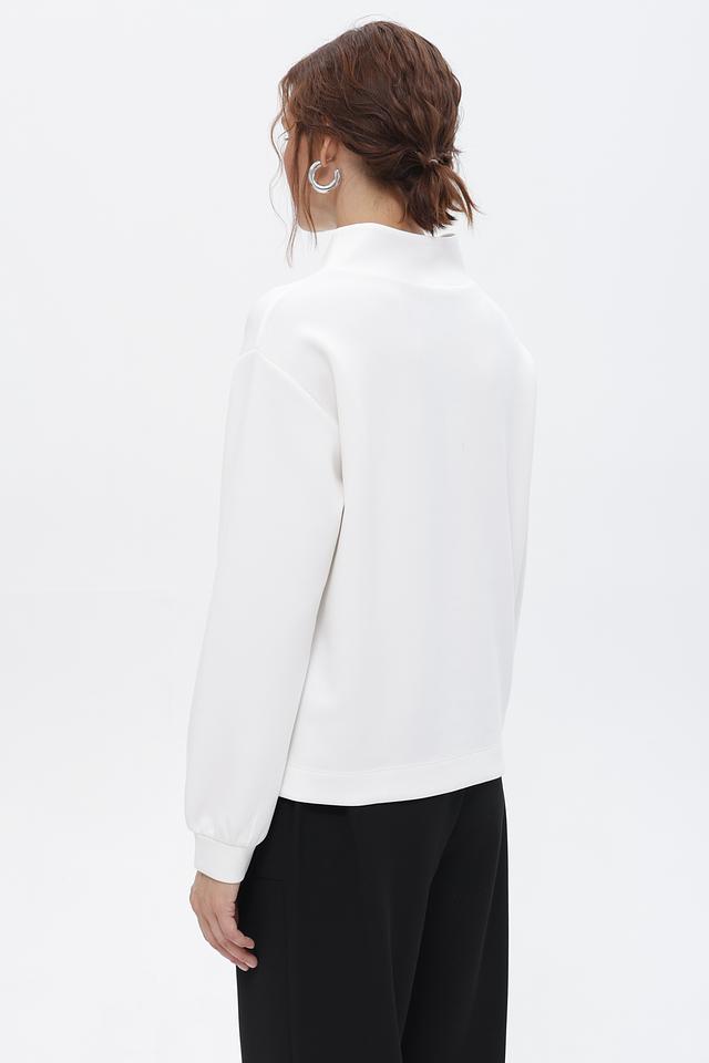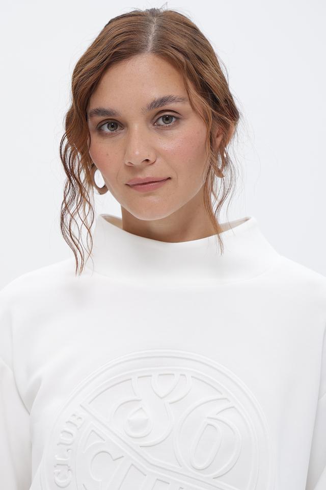 Пуловер имеет свободный крой, обеспечивающий комфорт в носке, и воротник-стойку, добавляющий изысканности. Главной особенностью модели является объёмный логотип, выполненный в тон ткани, придающий ей индивидуальность.