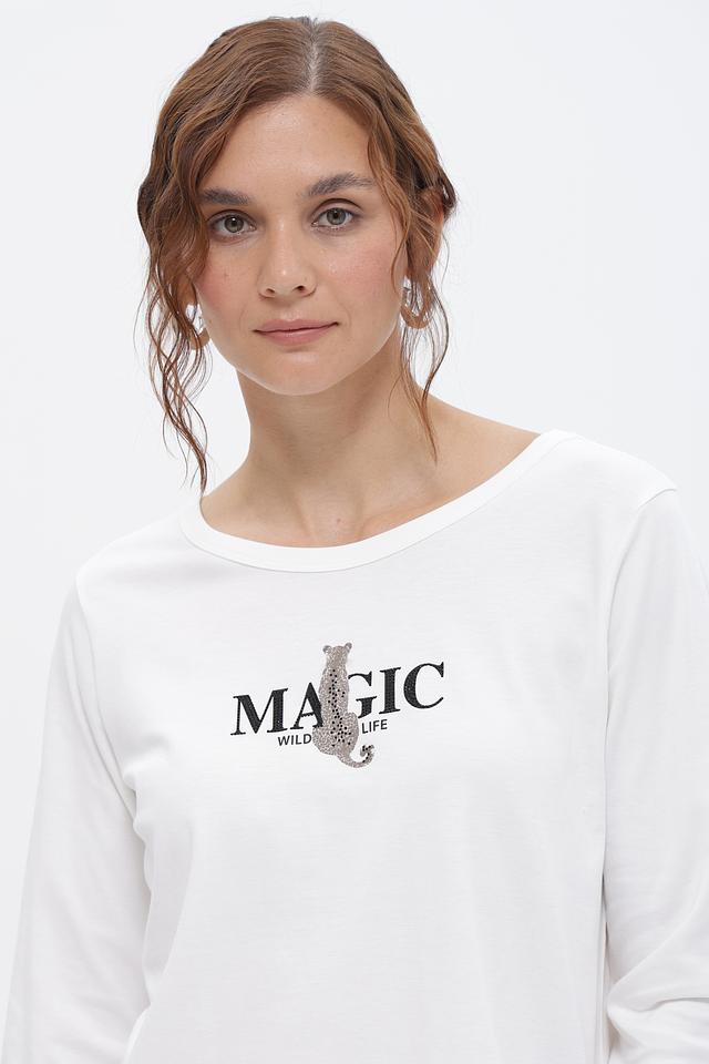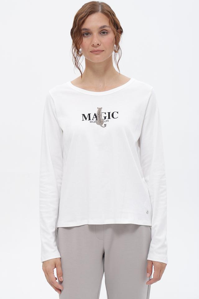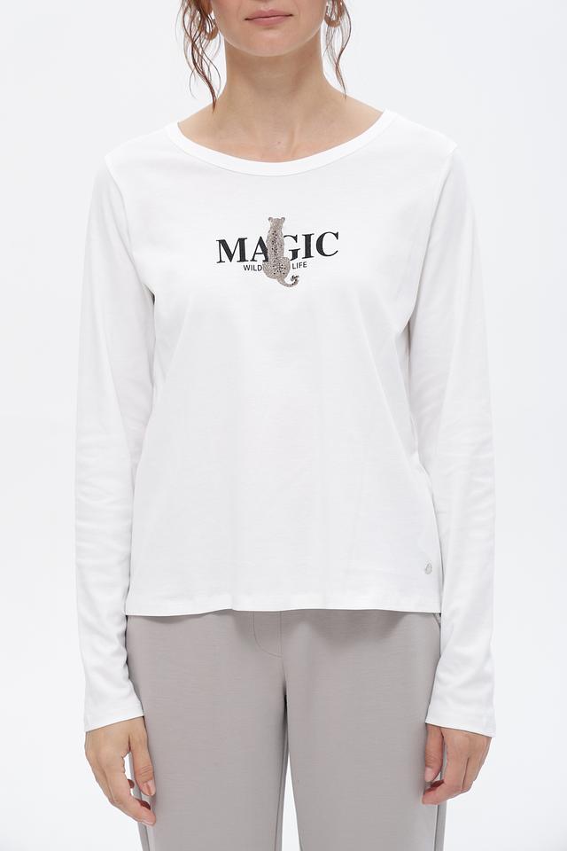 Белая футболка Monari с длинным рукавом и принтом “MAGIC”. Изготовлена из 100% хлопка, обеспечивающего комфорт и воздухопроницаемость. Отличный выбор для создания повседневных образов. Состав: хлопок 100%