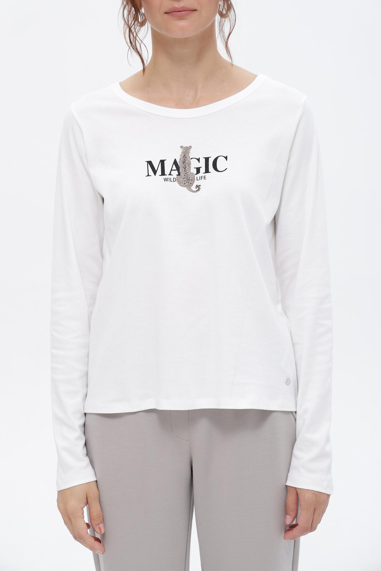 Базовая футболка Monari с длинным рукавом – идеальный выбор для создания стильных и комфортных образов. Модель выполнена из 100% хлопка, что обеспечивает максимальную воздухопроницаемость и приятные тактильные ощущения на протяжении всего дня. Классический крой и универсальный белый цвет делают эту футболку незаменимой в любом гардеробе. Оригинальный принт с надписью "MAGIC WILD LIFE" и изображением леопарда добавляет изделию изюминку и подчеркивает вашу индивидуальность.