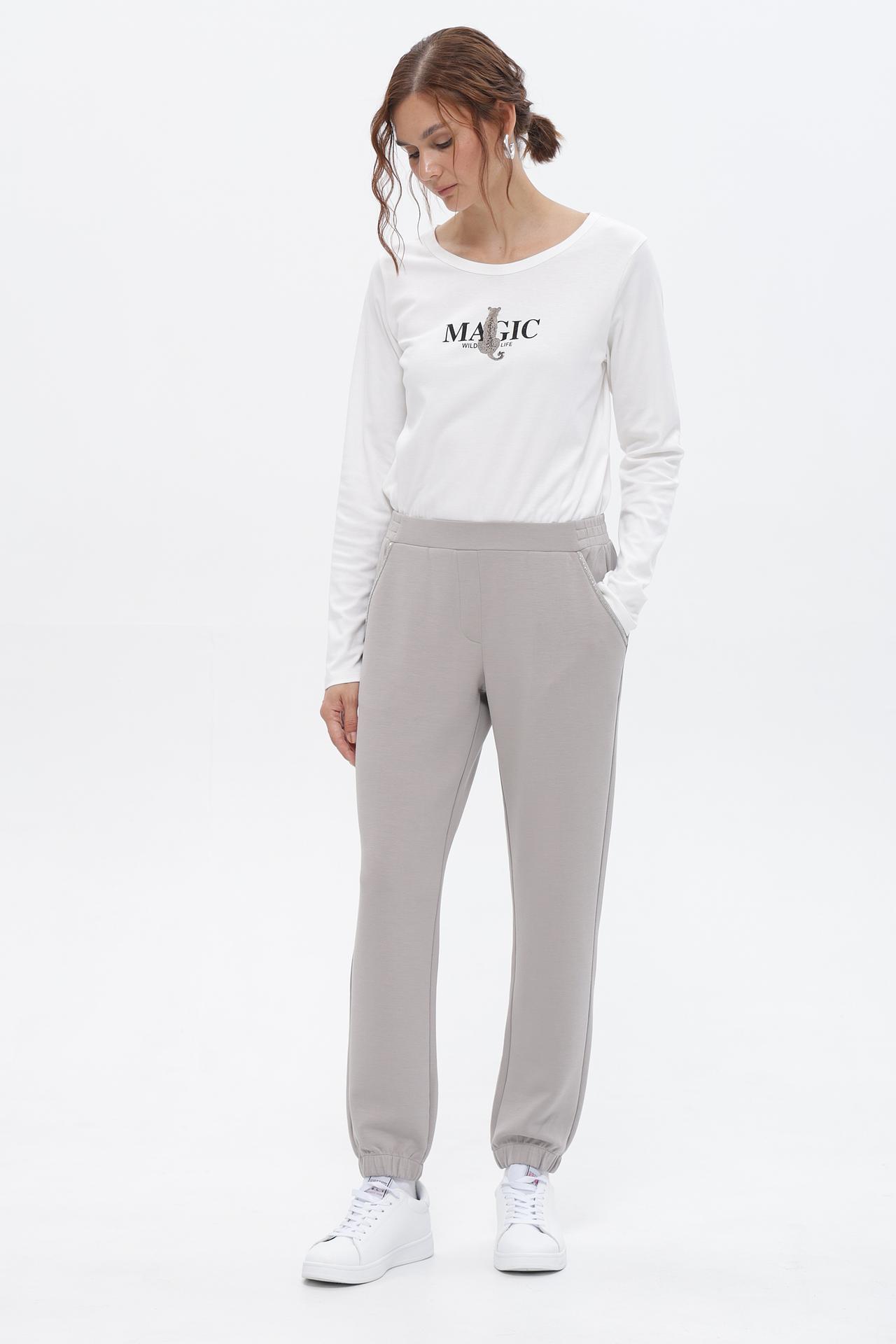 - Дизайн: Классический крой с эластичным поясом и манжетами на резинке. Карманы украшены деликатным декором из мелких бусин, добавляя образу нотку роскоши.