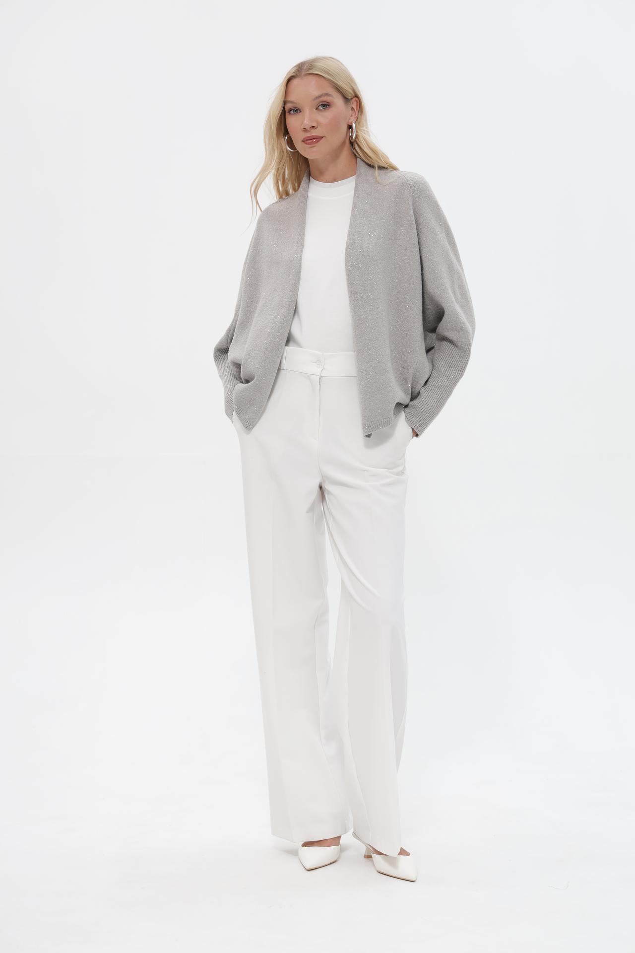 - Дизайн: Классический крой с открытым воротом и свободным силуэтом подчеркивает элегантность модели. Рукава с манжетами и лаконичный дизайн делают жакет актуальным вне времени.