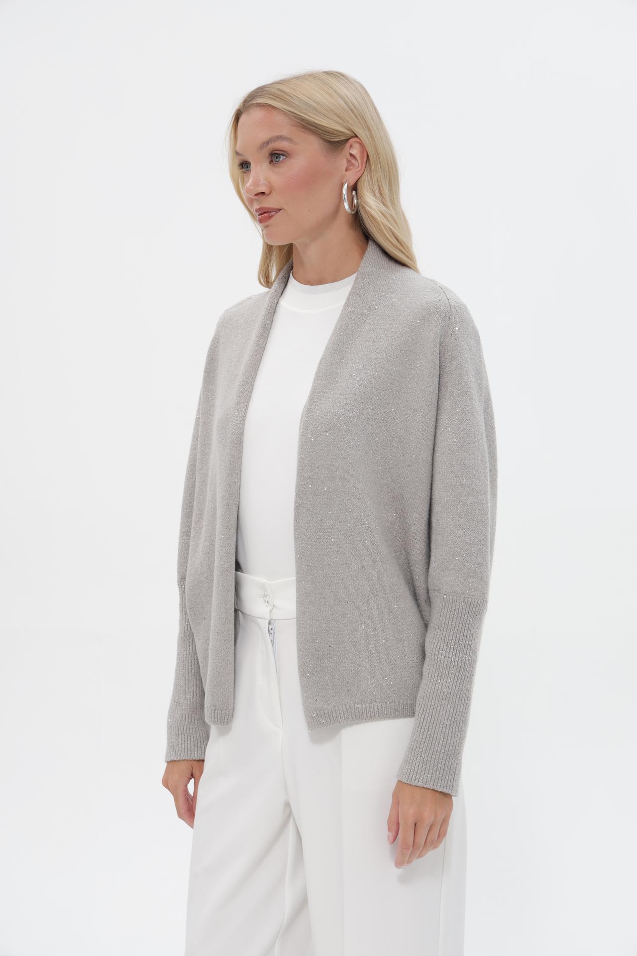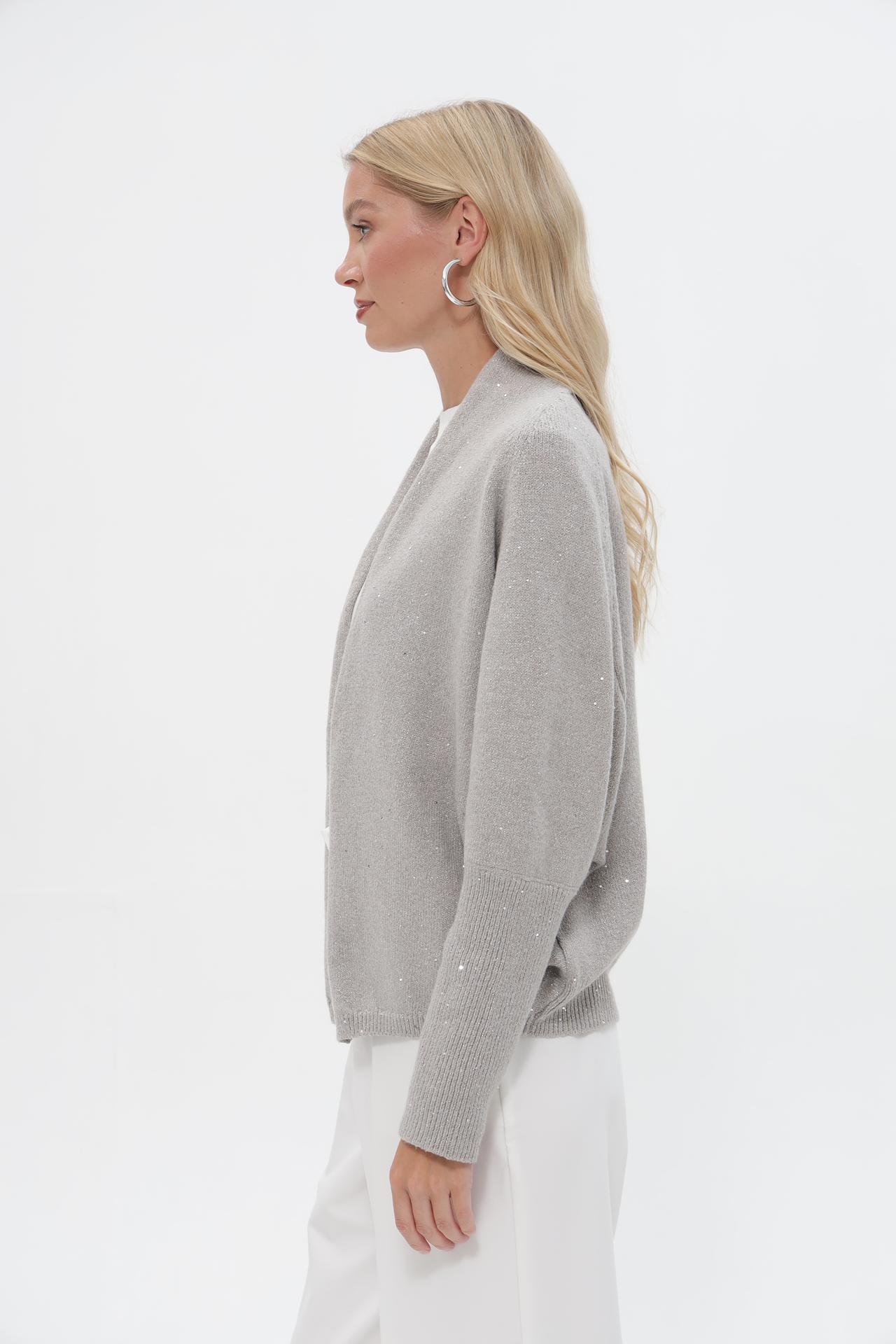 - Детализация: Нежное сияние мелких пайеток, равномерно распределенных по всей поверхности, придает жакету неповторимый праздничный вид. Эта деталь делает его особенным и привлекательным.