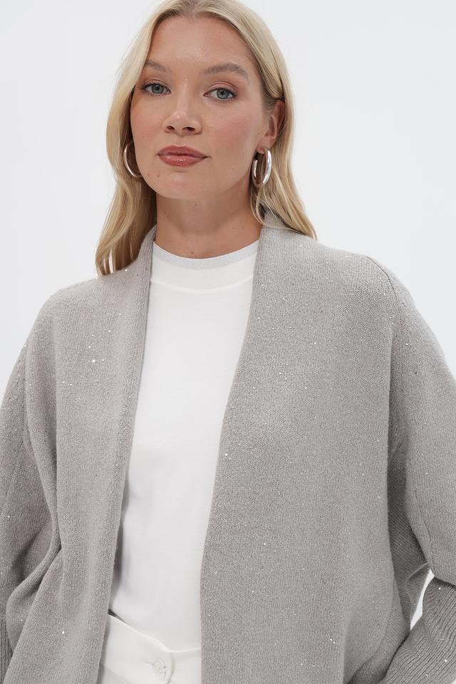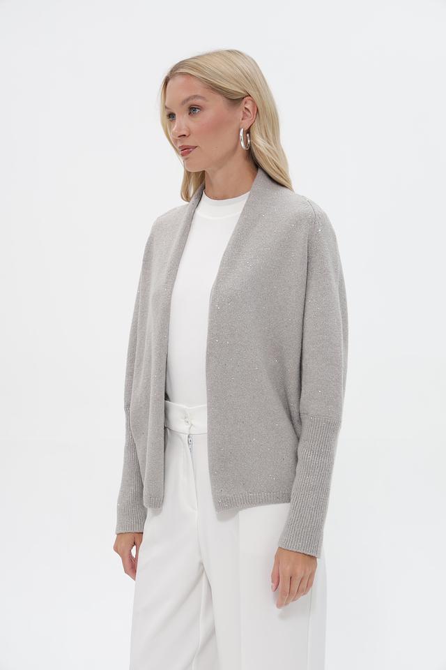 Жакет имеет свободный крой, длинные рукава и воротник-стойку. Отсутствие застежки позволяет легко создавать различные образы, а вязаный трикотаж обеспечивает комфорт в носке.