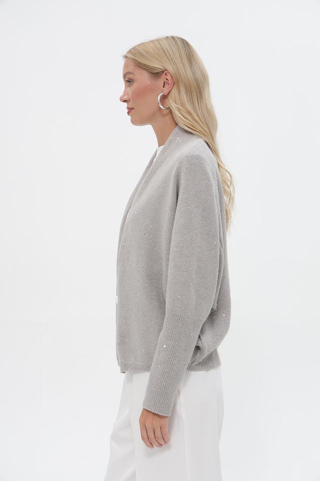 Представляем элегантный жакет от бренда Monari. Модель выполнена в сером цвете и украшена деликатной вышивкой из пайеток, что придает ей особый шарм.