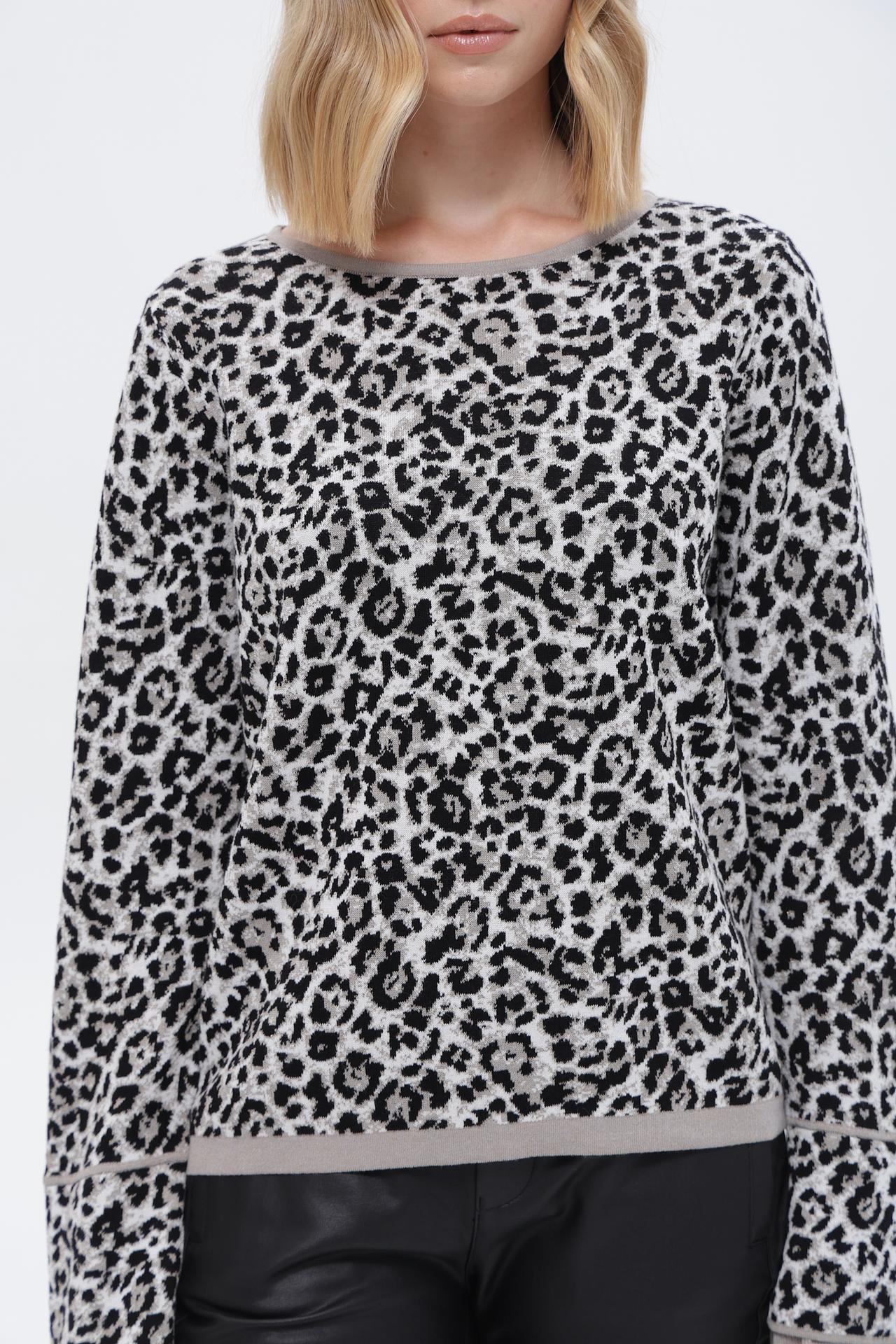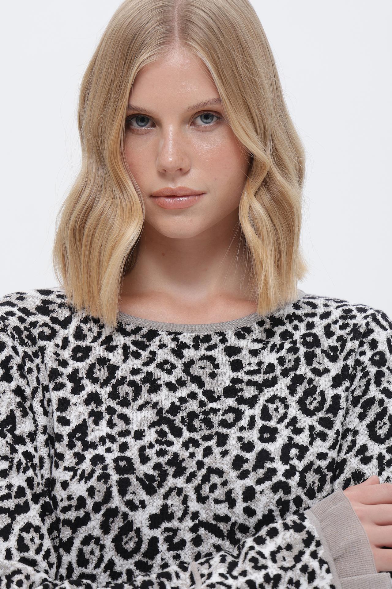- Дизайн: Яркий леопардовый принт в черно-белой гамме делает пуловер стильным акцентом. Оригинальные манжеты с воланами добавляют модели игривости и женственности.