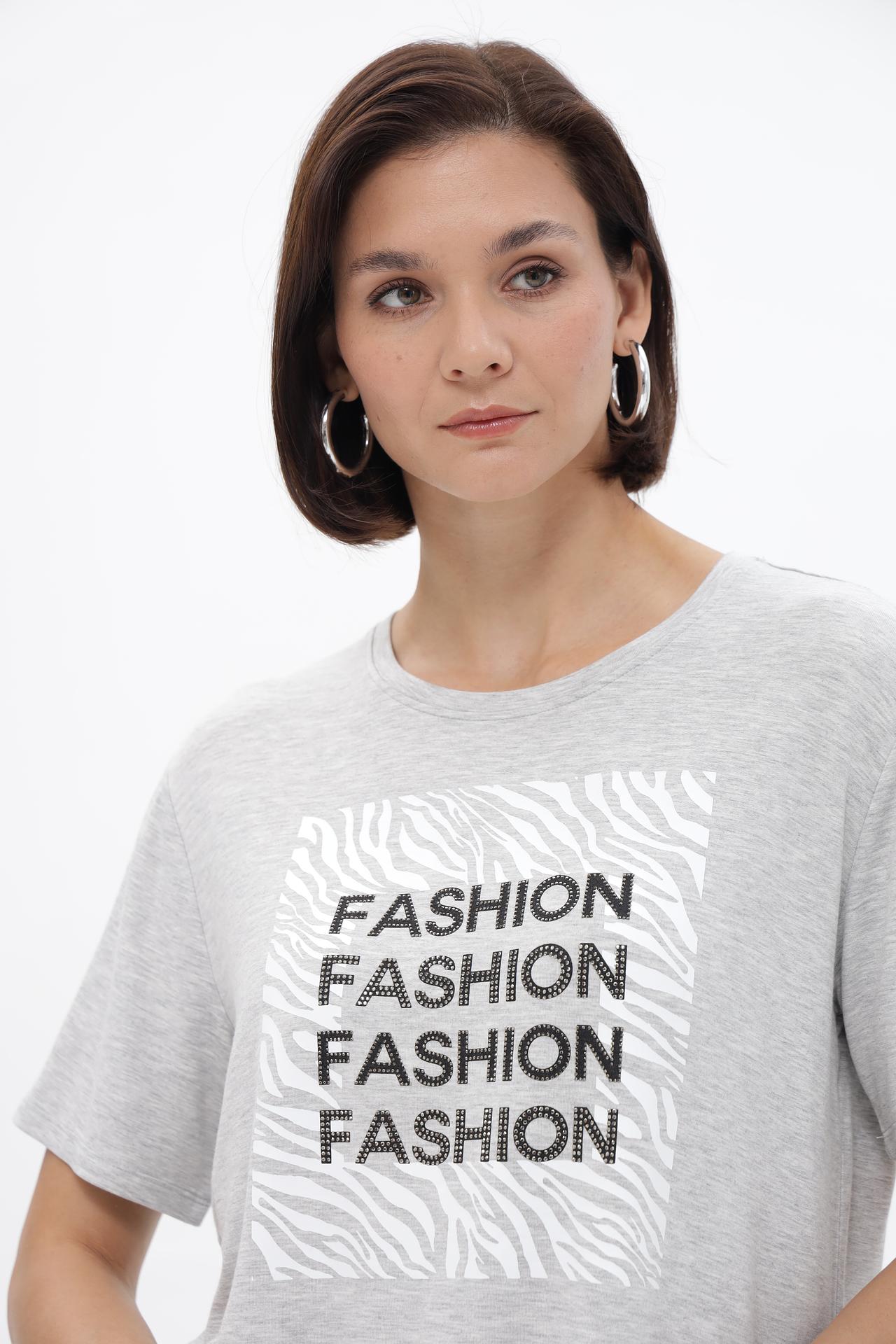 Дизайн футболки дополнен эффектным принтом с надписью FASHION, выполненным на фоне анималистичного узора, напоминающего зебру. Этот акцент придает изделию особую изюминку и делает его заметным.