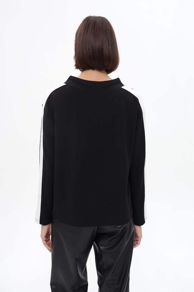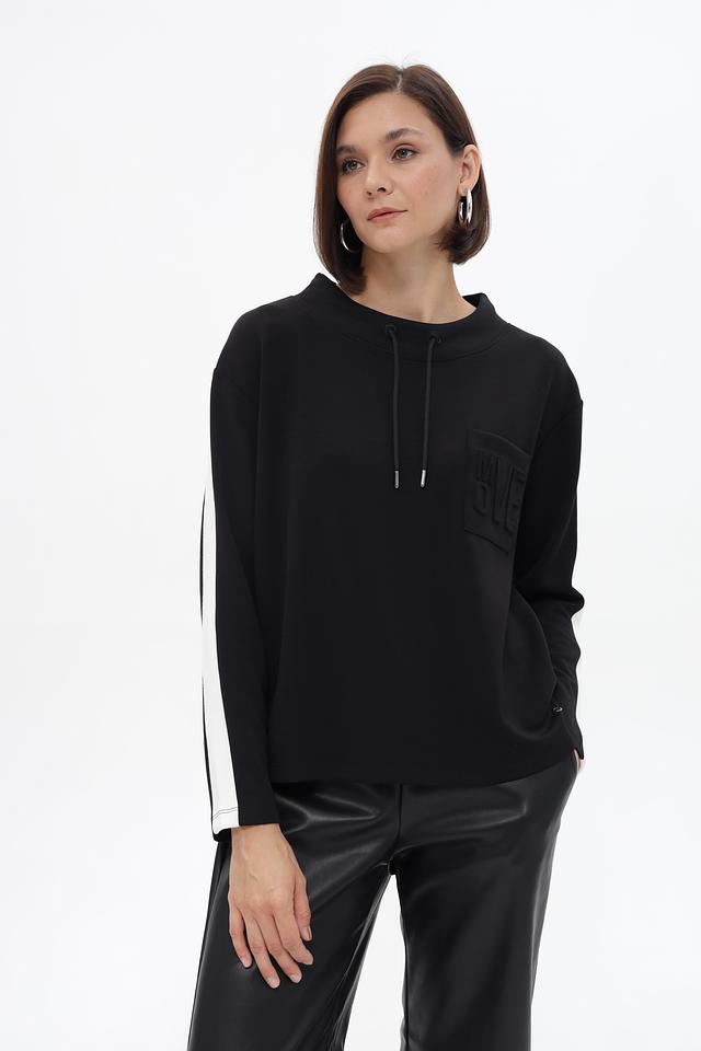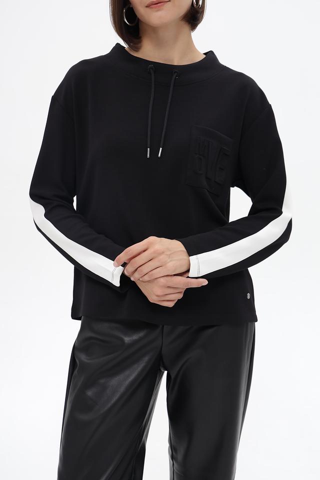 Чёрный пуловер от Monari с декоративной полосой на рукаве. Изготовлен из мягкого модала с добавлением полиэстера и эластана, обеспечивающих комфорт и отличную посадку. Состав: модал 52%, полиэстер 42%, эластан 6%