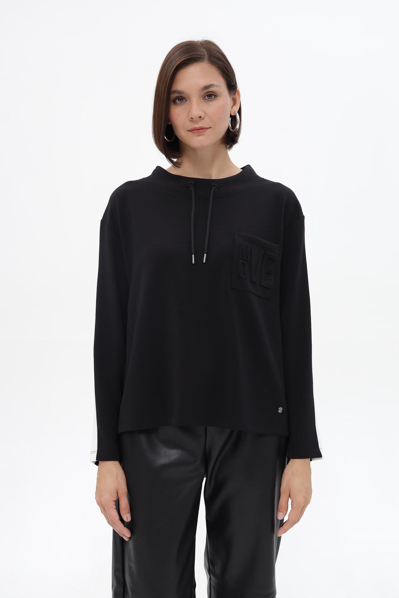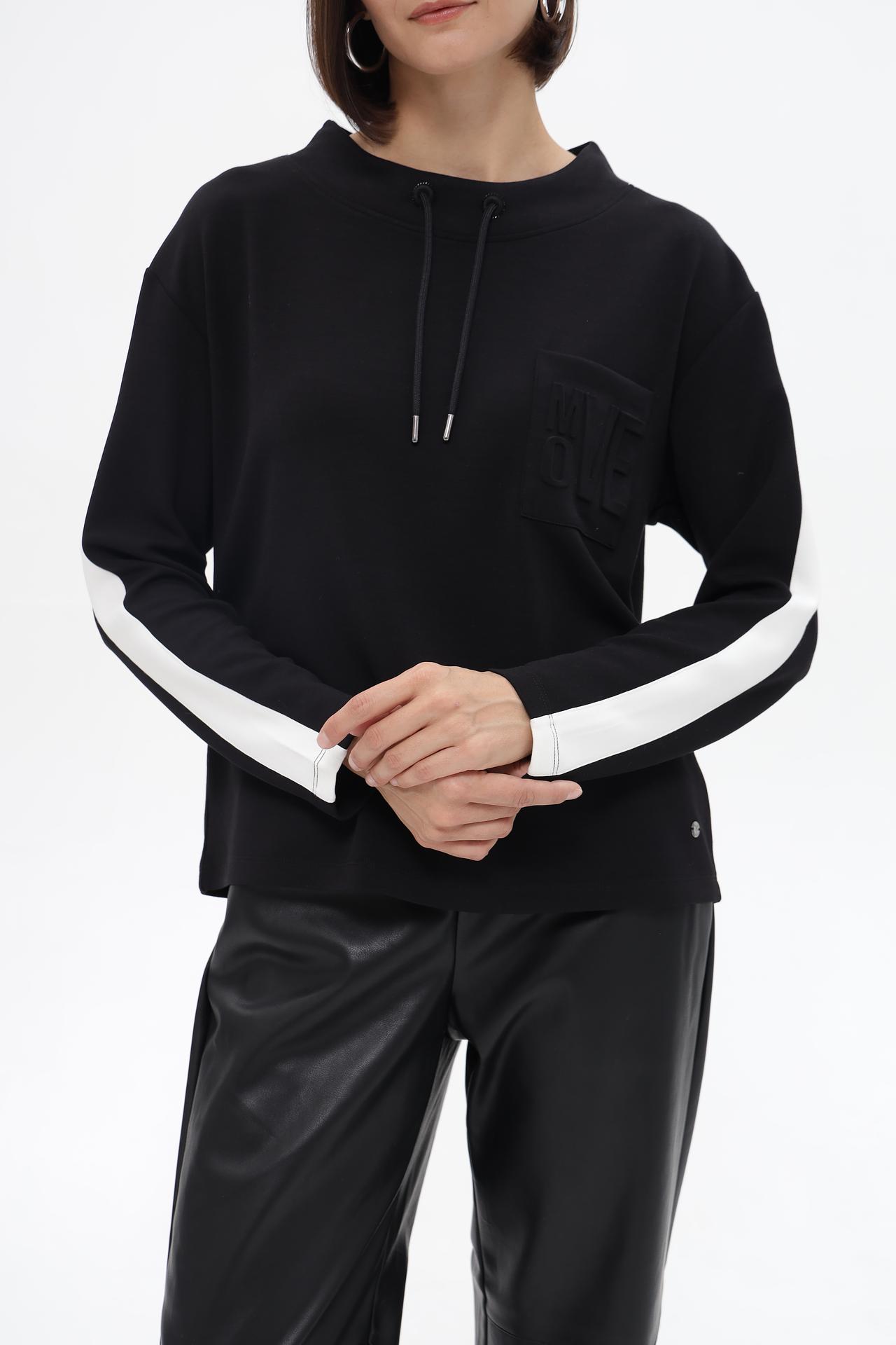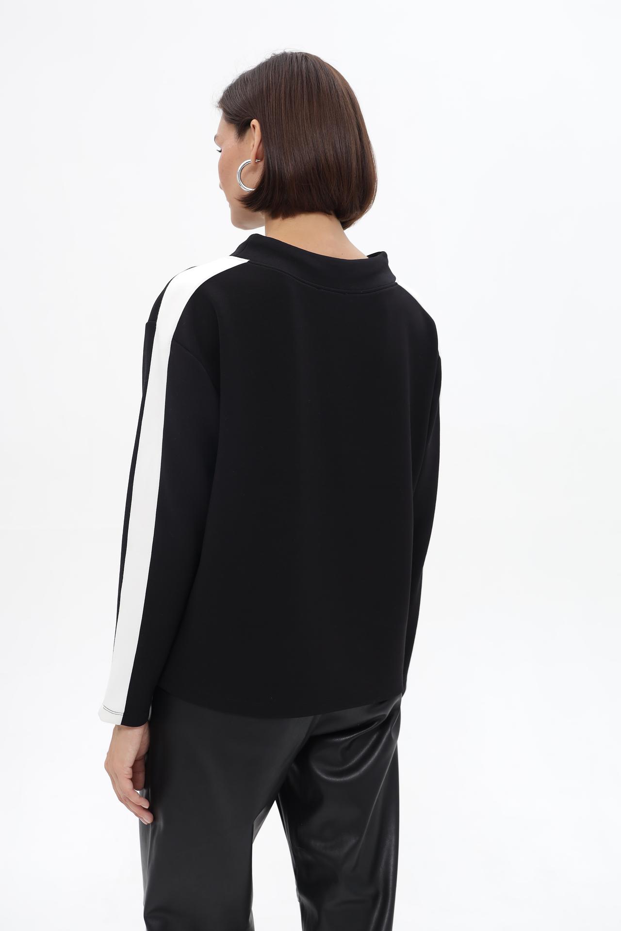 Элегантный пуловер от Monari — идеальное дополнение к вашему повседневному гардеробу. Изделие выполнено в классическом чёрном цвете с контрастной белой полосой на рукавах, что придает ему особый шарм и динамичность. Модель с высоким воротом и удобным карманом на груди обеспечивает комфорт и стиль.