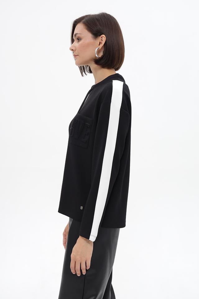 Декоративной особенностью пуловера является контрастная белая полоса, расположенная на рукавах, и объемная надпись 'LOVE' на нагруди. Модель дополнена капюшоном со шнурками. Пуловер идеально подходит для создания повседневных образов.