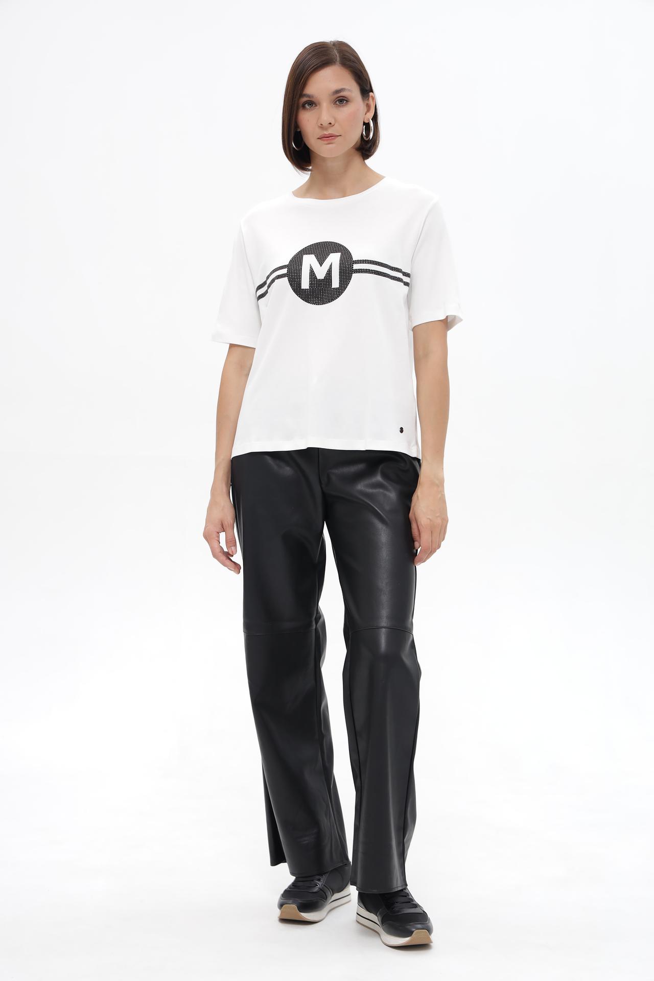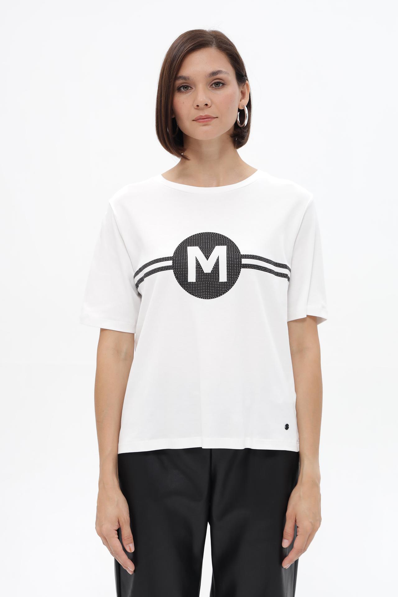 - Принт с буквой «M» – крупная буква «M» в круге, дополненная мелкими стразами, придает футболке индивидуальность и модный акцент.