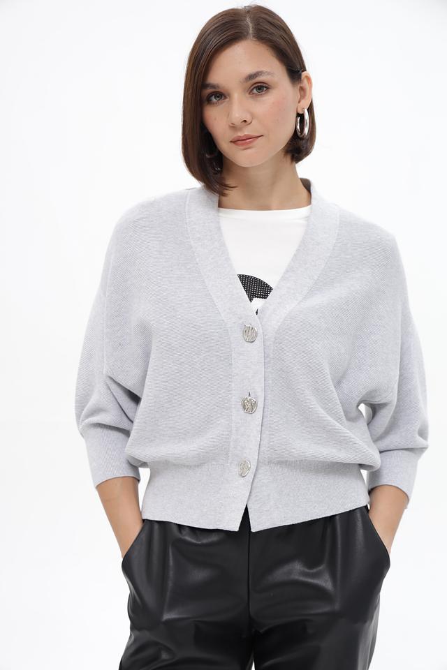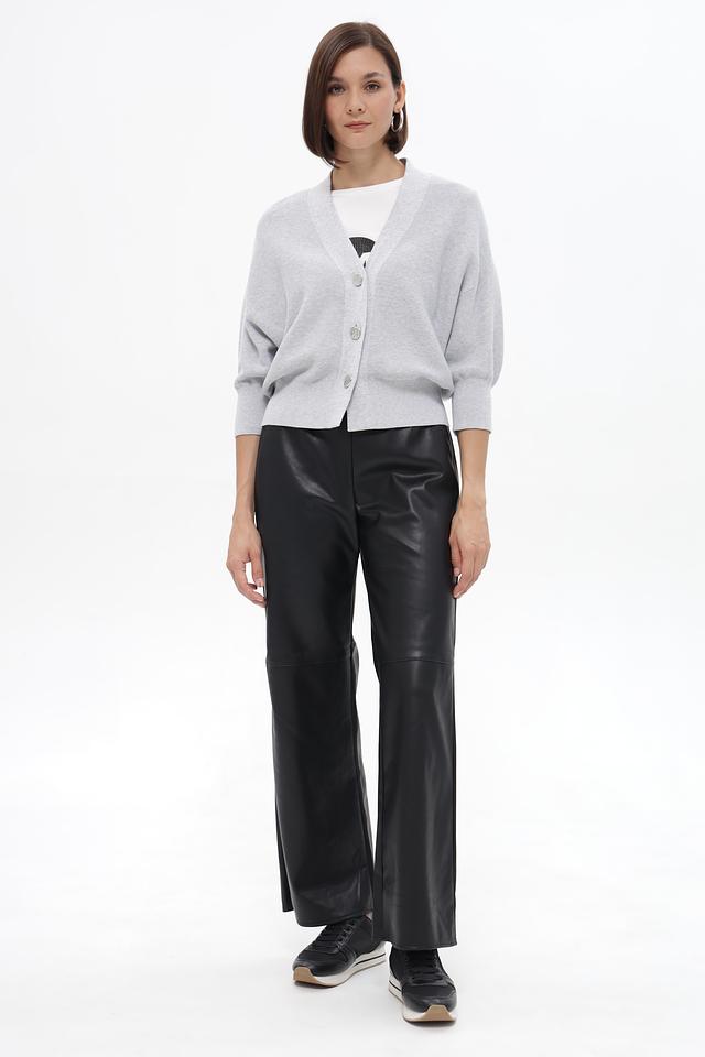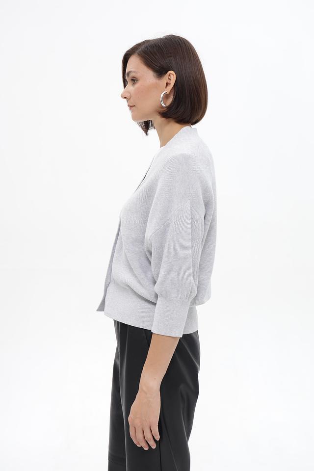 Жакет имеет V-образный вырез, который визуально удлиняет шею и подчеркивает линию декольте. Застежка выполнена на ряд декоративных пуговиц. Рукава 3/4 добавят образу лёгкости и непринужденности.
