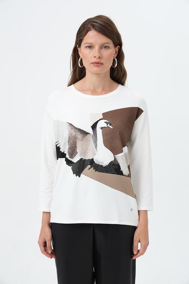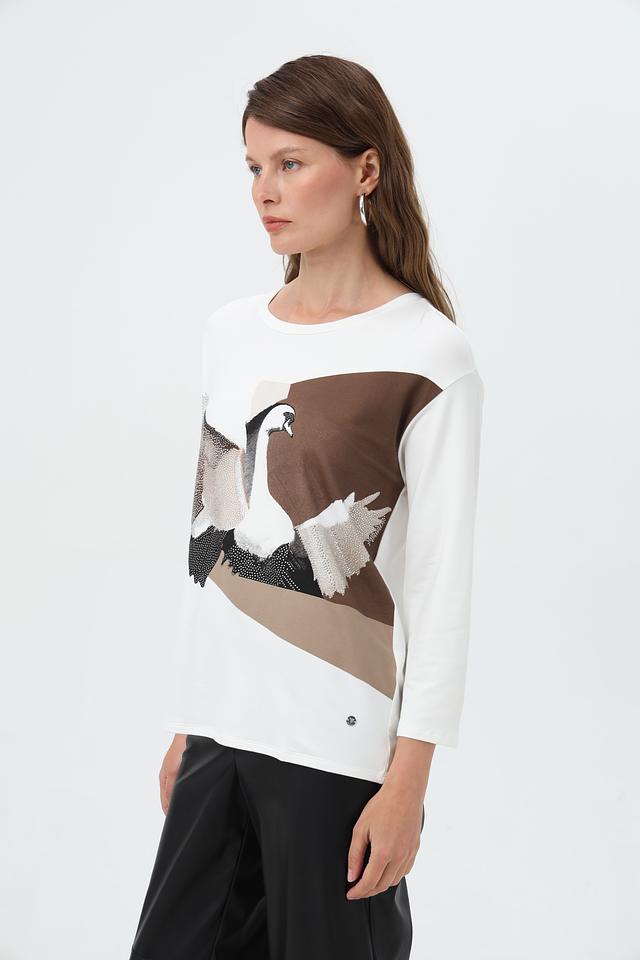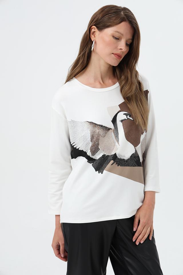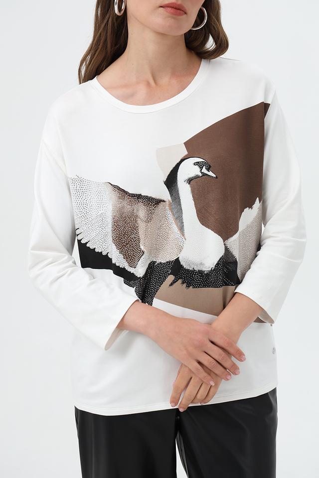 Белый лонгслив Monari с эффектным принтом лебедя станет ярким акцентом вашего образа. Модель выполнена из приятной к телу ткани, рукав 3/4. Состав: вискоза 95%, эластан 5%