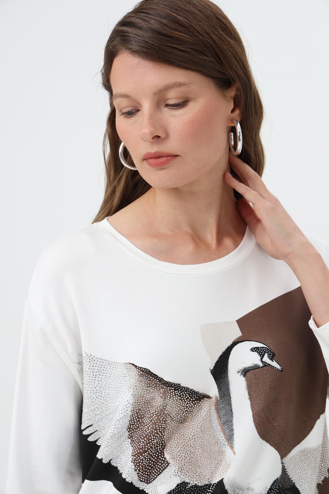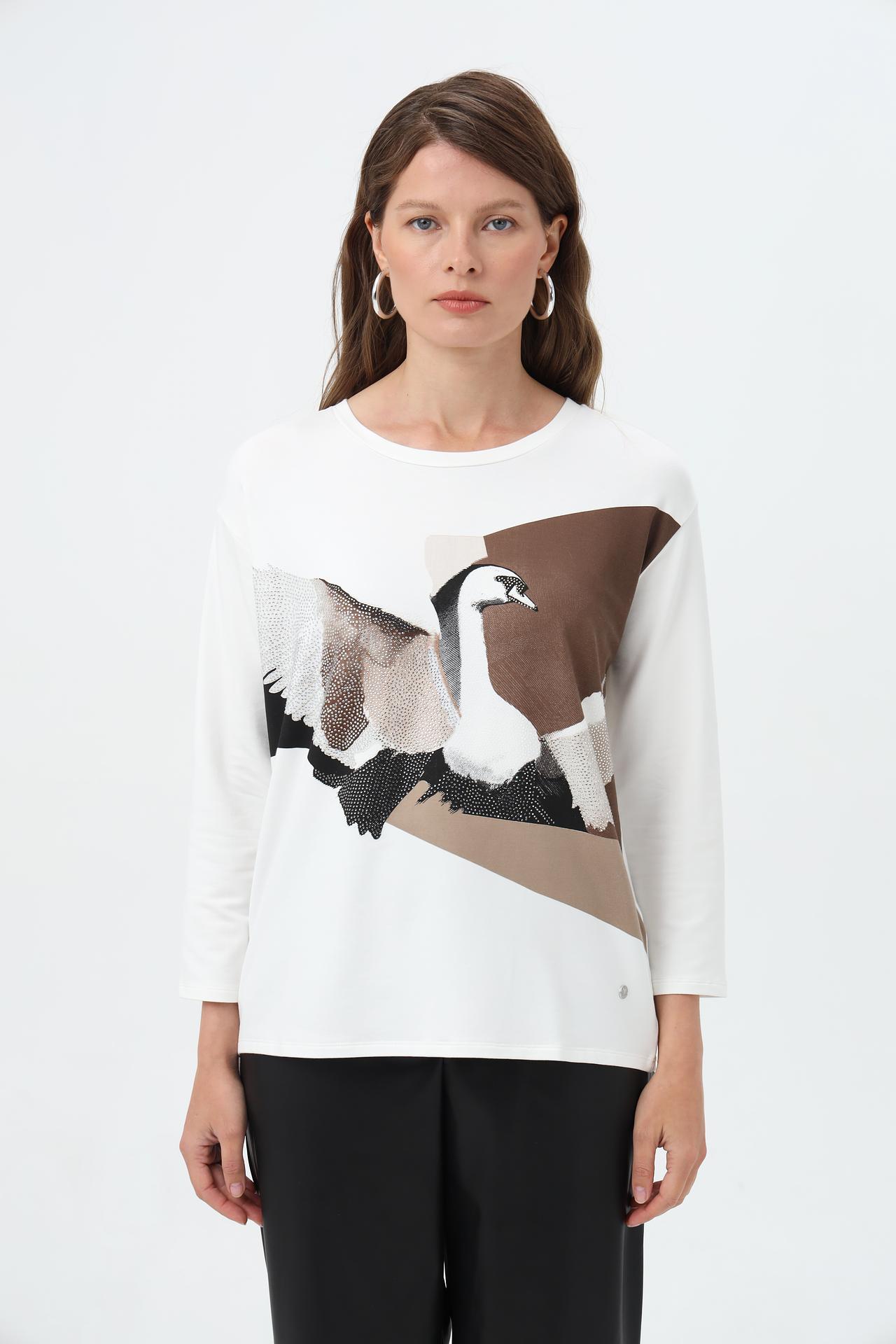 - Дизайн: Оригинальный принт с изображением лебедя и абстрактными геометрическими формами, украшенный сверкающими деталями. Современный дизайн, который притягивает взгляды и добавляет изюминку в образ.