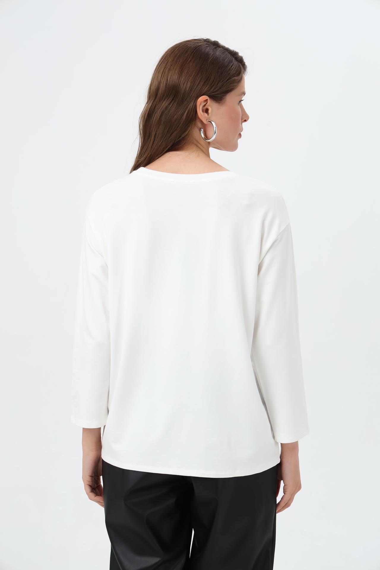 - Универсальность: Классический крой и нейтральный цвет делают эту футболку универсальной. Она легко сочетается с различными брюками, юбками и жакетами, создавая множество модных комбинаций.