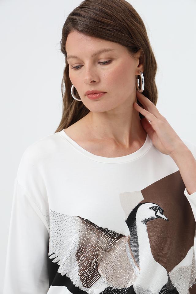 Модель украшена оригинальным принтом в виде лебедя, выполненным в сочетании коричневых, серых и черных оттенков.
