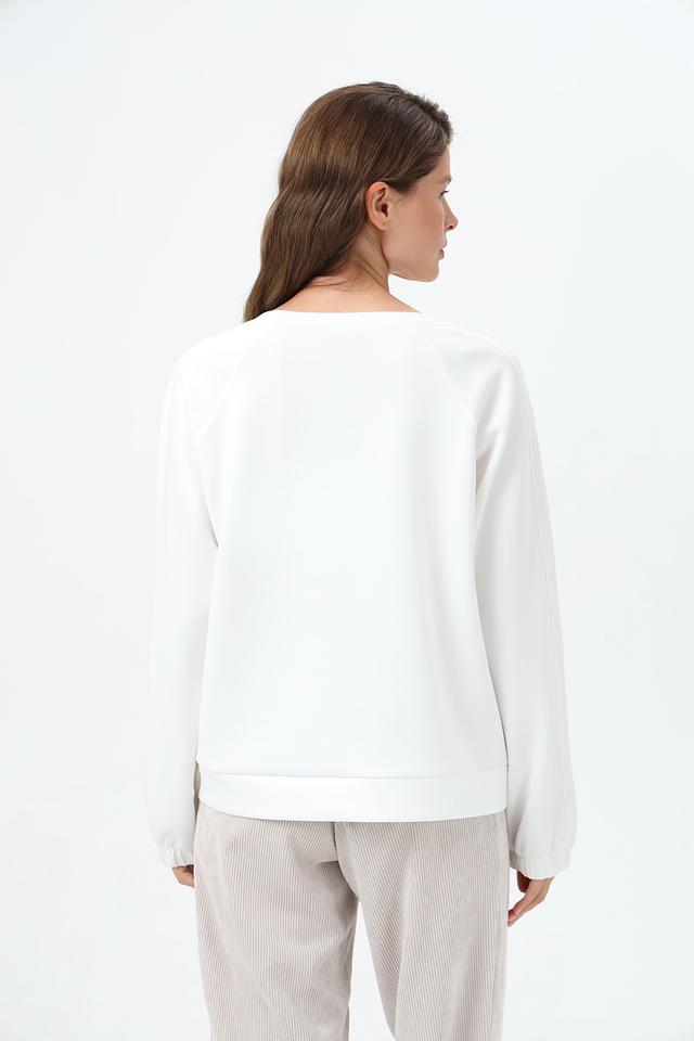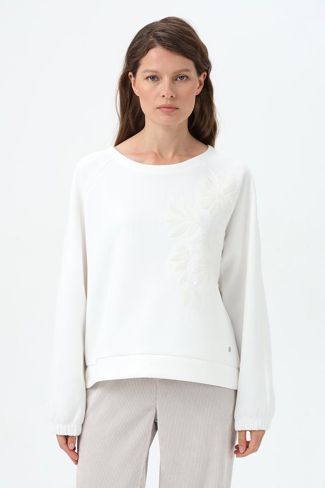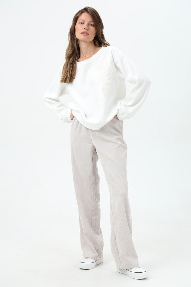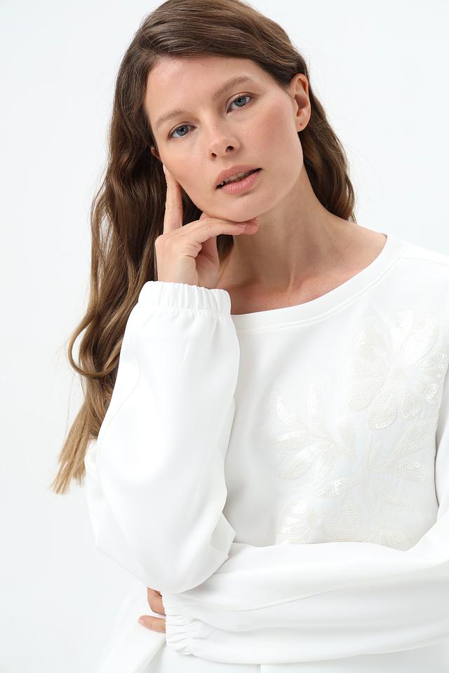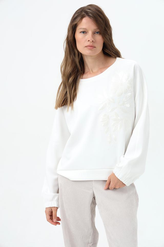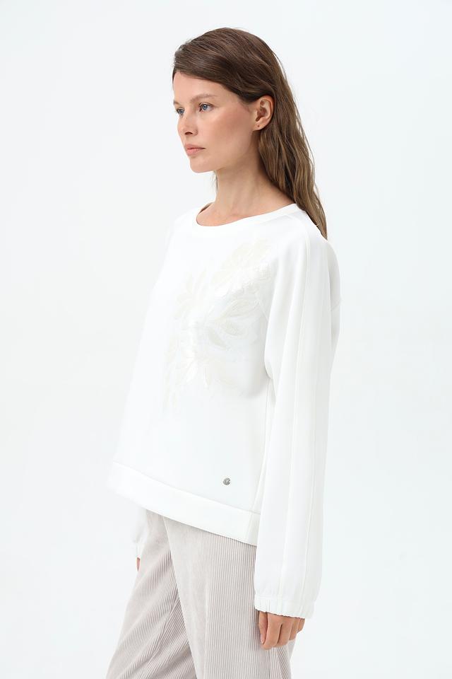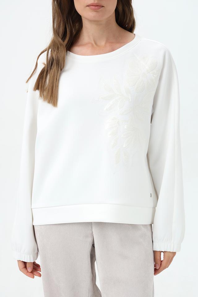 Изящный пуловер от бренда Monari, выполненный в белом цвете. Модель украшена золотистой вышивкой в виде растительного орнамента на передней части. Пуловер имеет округлый вырез горловины и длинные рукава с небольшими сборками в области манжет, придающими образу лёгкость и воздушность.