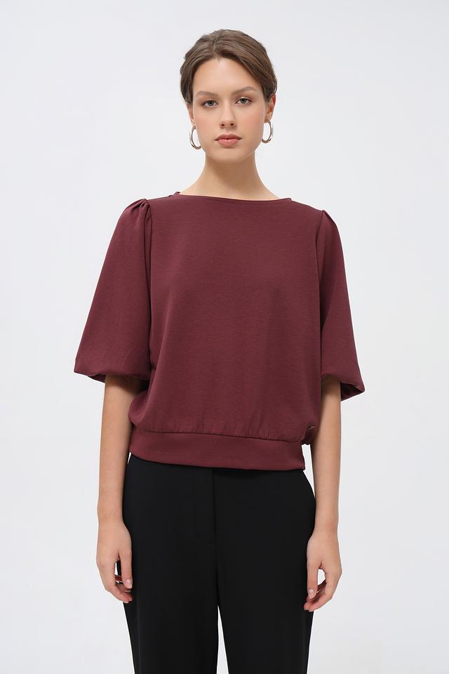 Бордовый пуловер Monari с короткими рукавами-фонариками и округлым вырезом. Изготовлен из мягкой ткани с добавлением эластана для комфортной посадки. Стильный и элегантный выбор для создания повседневного образа. Состав: полиэстер 55%, вискоза 38%, эластан 7%