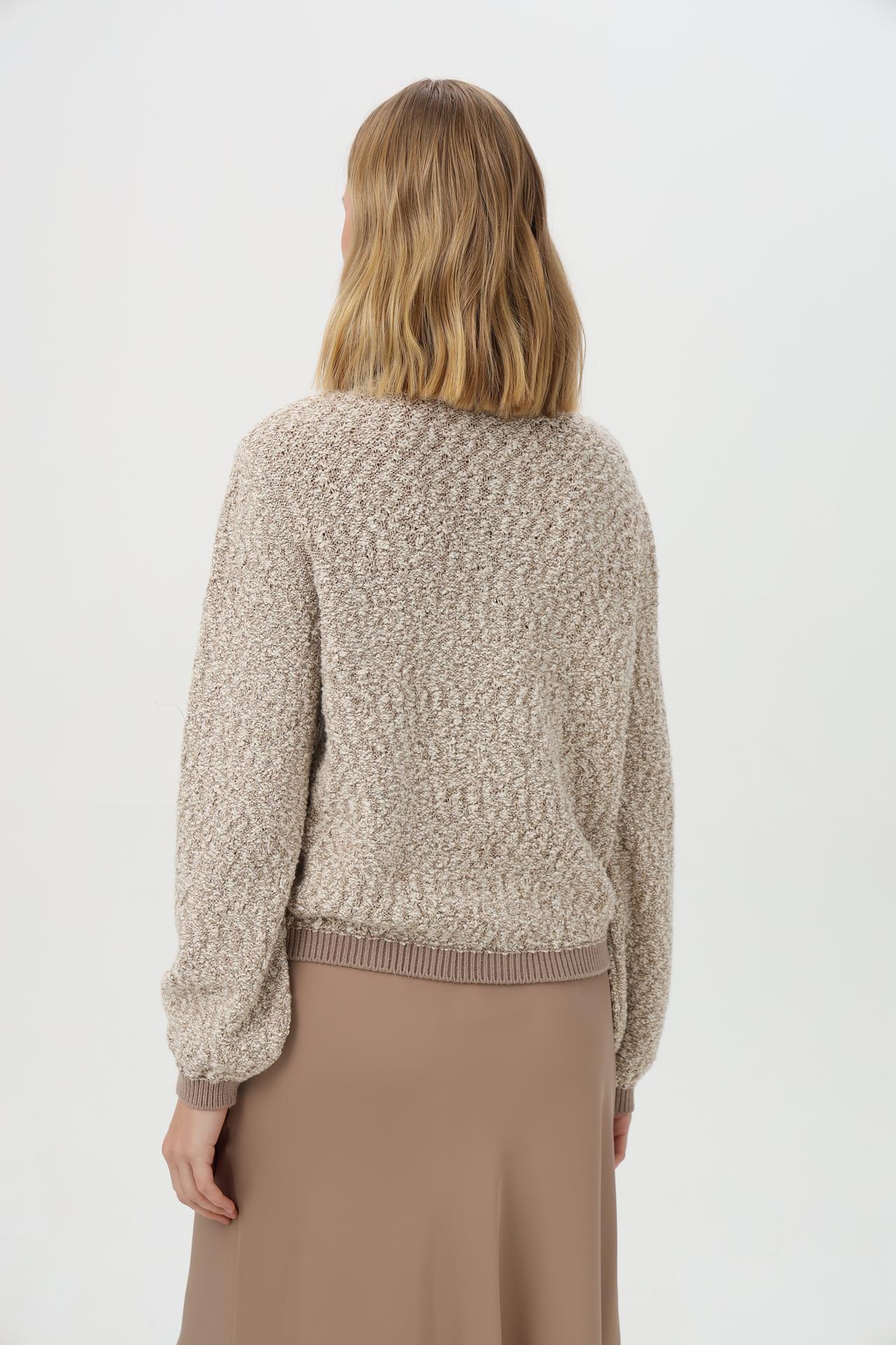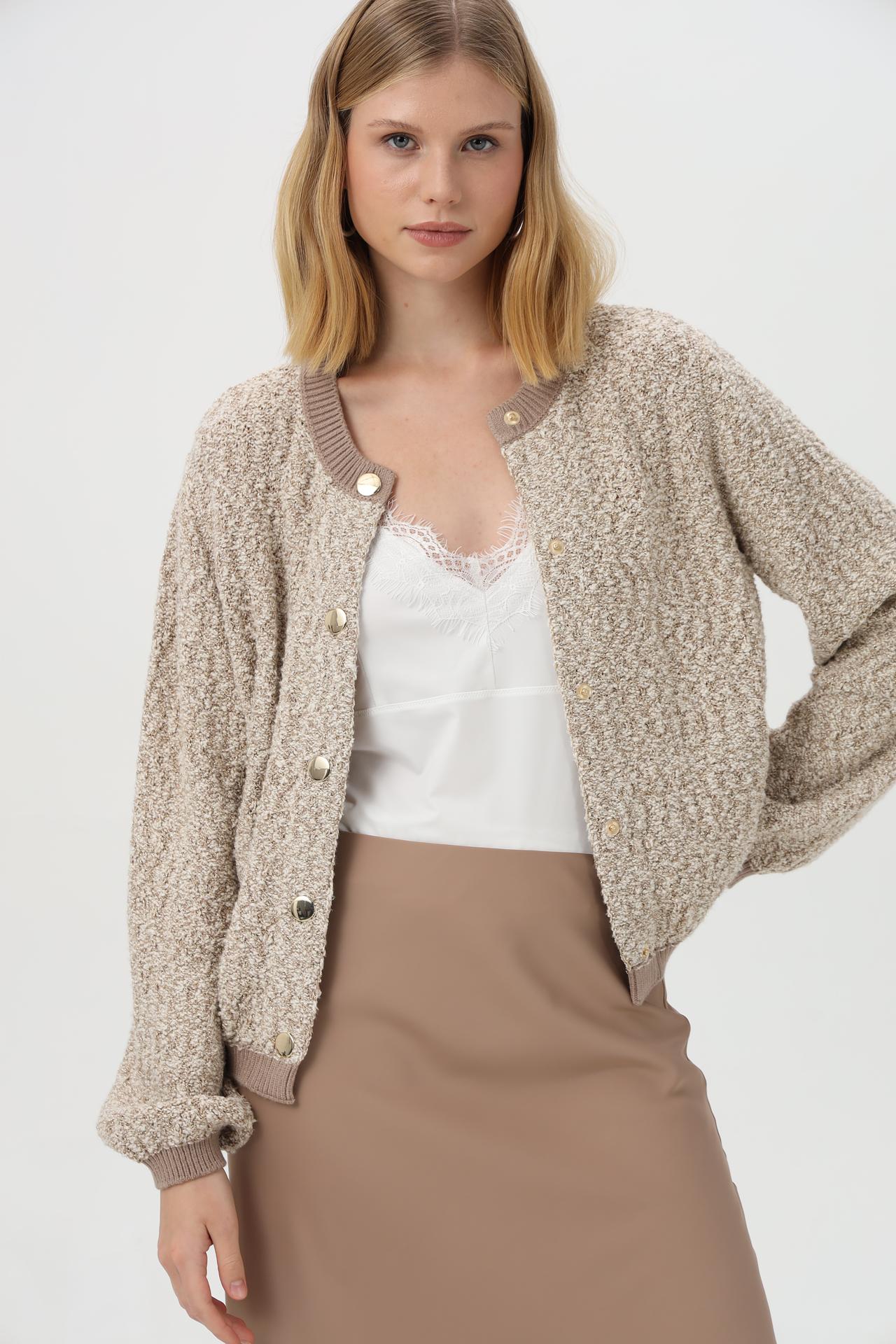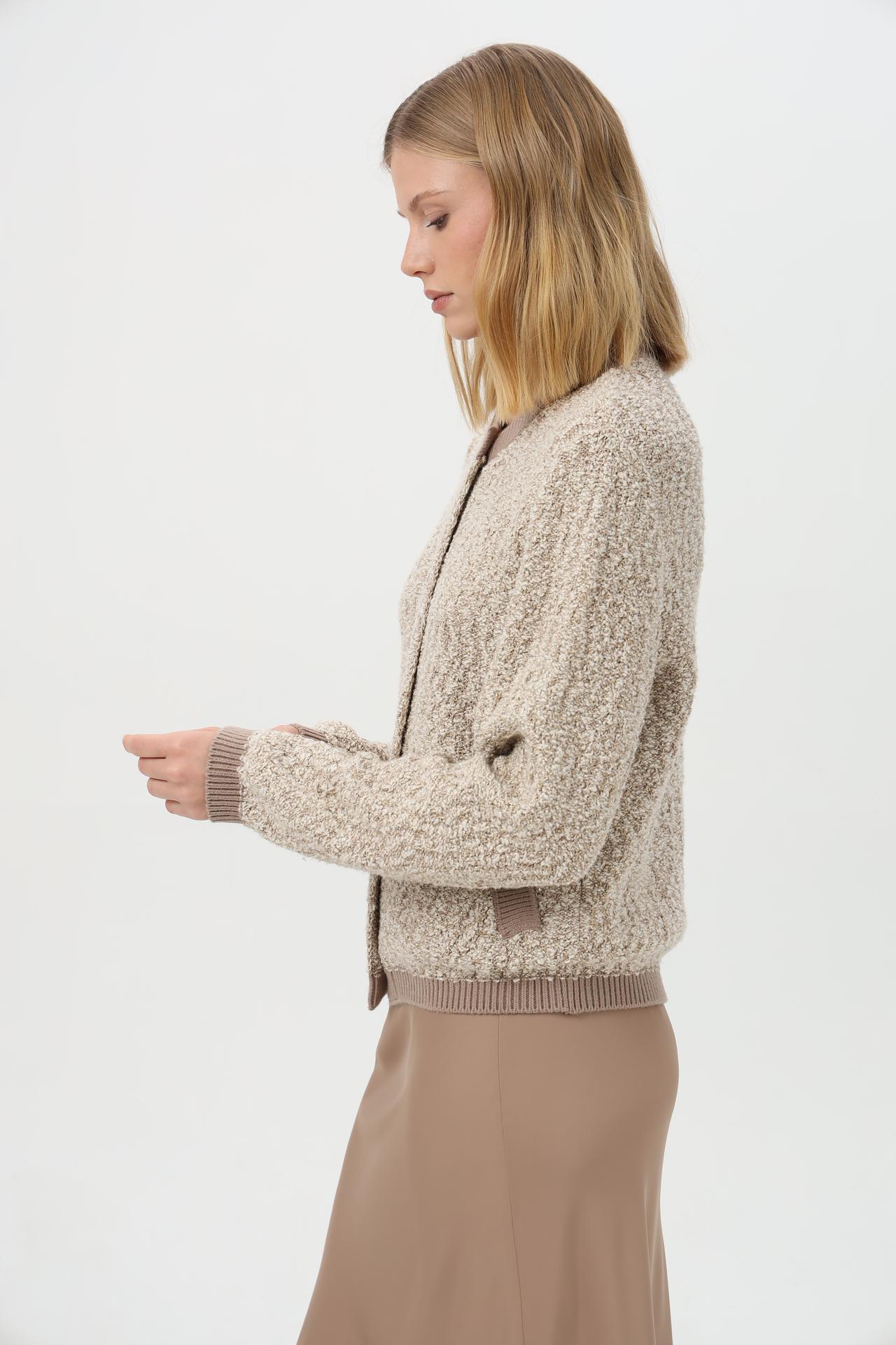 - Дизайн: Классический бомбер с круглым вырезом и застежкой на золотистые пуговицы. Текстурная вязка и вкрапления люрекса создают эффектный внешний вид.
