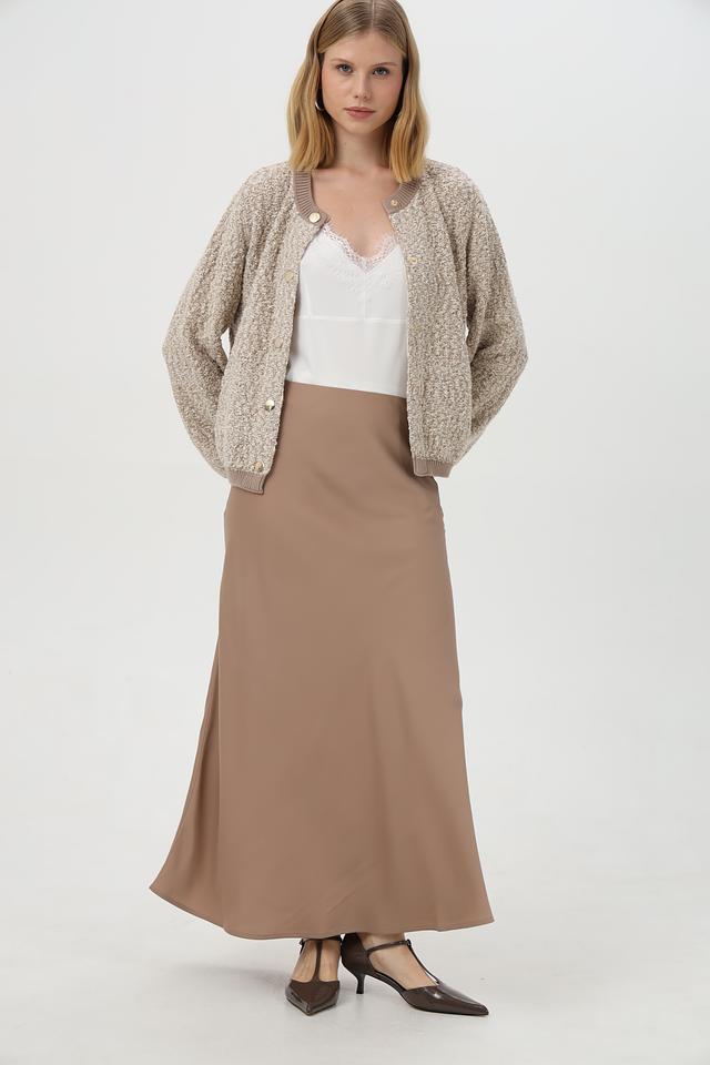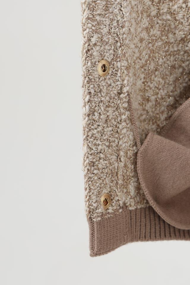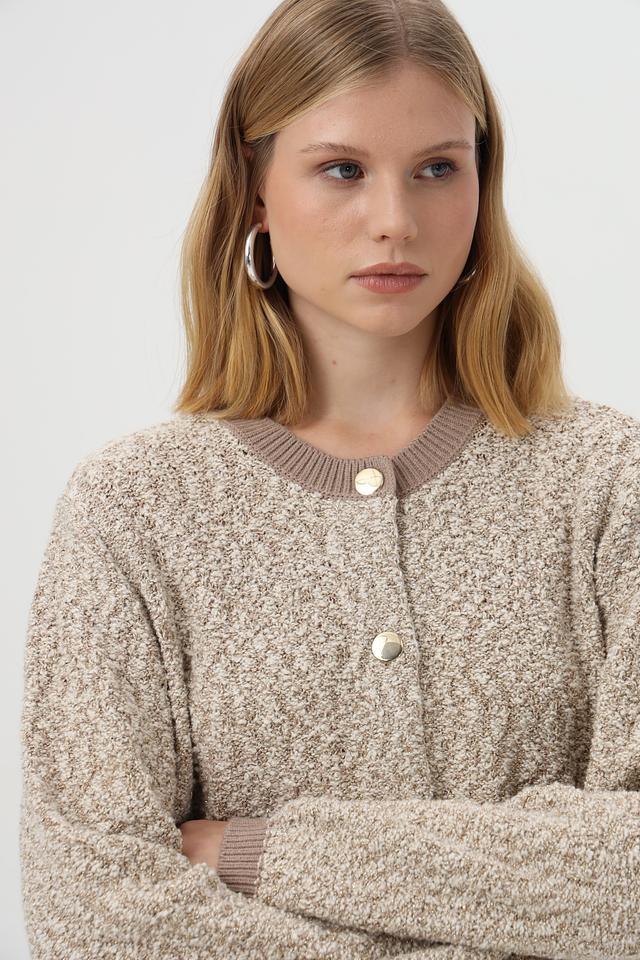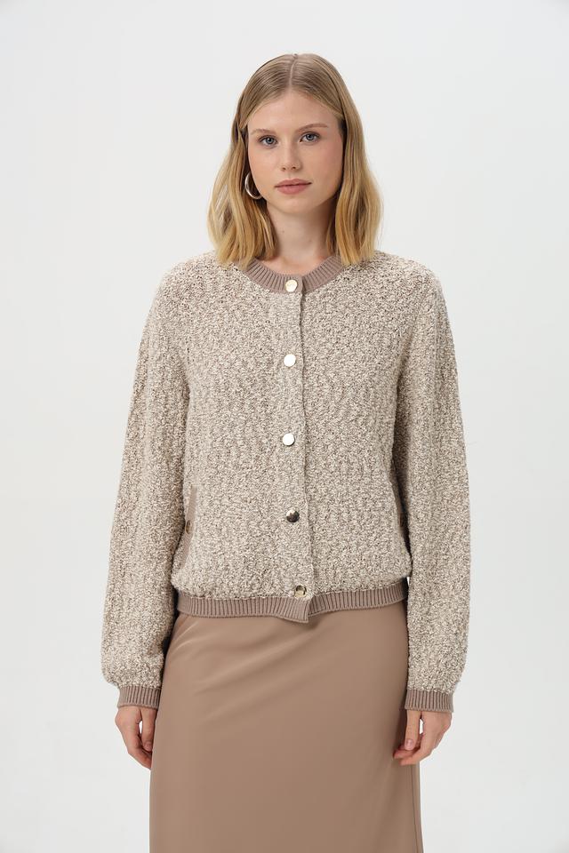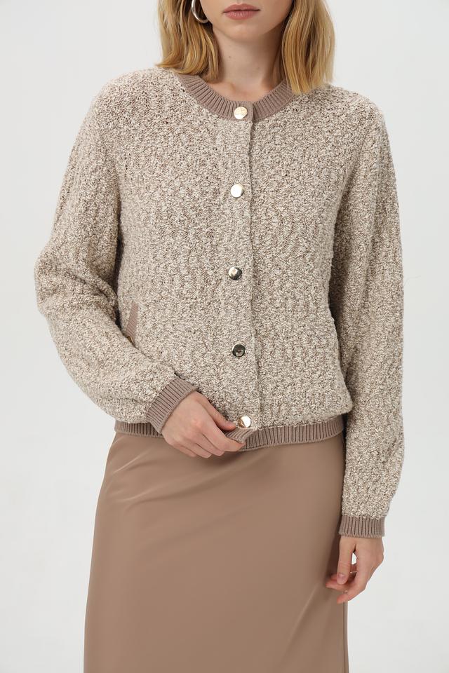 Жакет имеет бежевый цвет и фактурную вязаную структуру. Застёжка на пуговицы позволяет регулировать степень прилегания. Укороченный крой и рукава-фонарики придают модели современный и стильный вид.